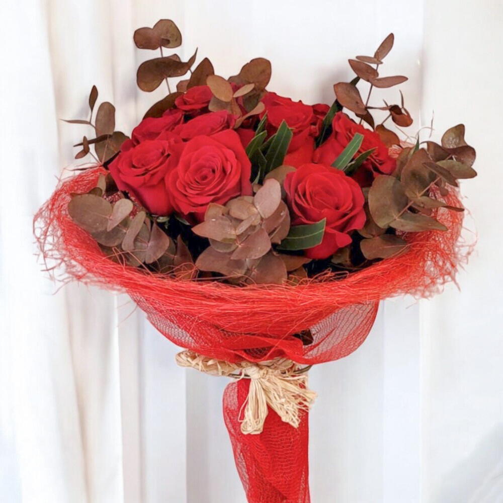 Ce bouquet associe la passion et l'élégance des roses rouges à la texture unique de l'eucalyptus teinté dans des tons foncés, créant une composition sophistiquée et charmante. Enveloppé dans une maille rouge qui rehausse son intensité, ce design est parfait pour exprimer l'amour et l'admiration en toute occasion spéciale. Idéal pour les anniversaires, les fêtes d'anniversaire ou simplement pour surprendre avec un détail plein de style. Un cadeau qui transmet des émotions profondes et laisse une impression inoubliable !