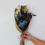 tiges d'eucalyptus préservées - 3 pce tiges de lavande séchée - 3 pce branches de solidago jaunes et séchées - 2 pce branches de fougère rose clair préservées - 2 pce branches de statice bleues séchées - 3 pce capsule de pavot séchée - 1 pce rameaux d'avoine blanche séchée - 2 pce