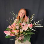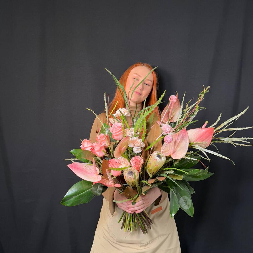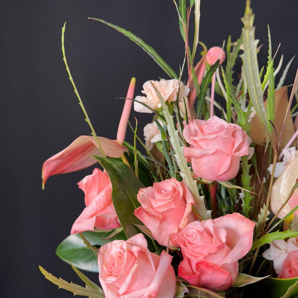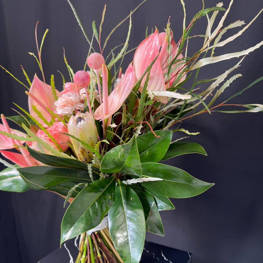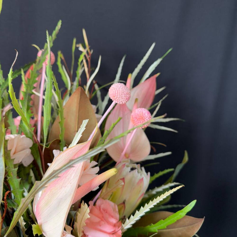 Anthurium - 7 pce craspedia - 5 pce protéa - 2 pce rosa - 10 pce claveles - 5 pce grevillea - 5 pce