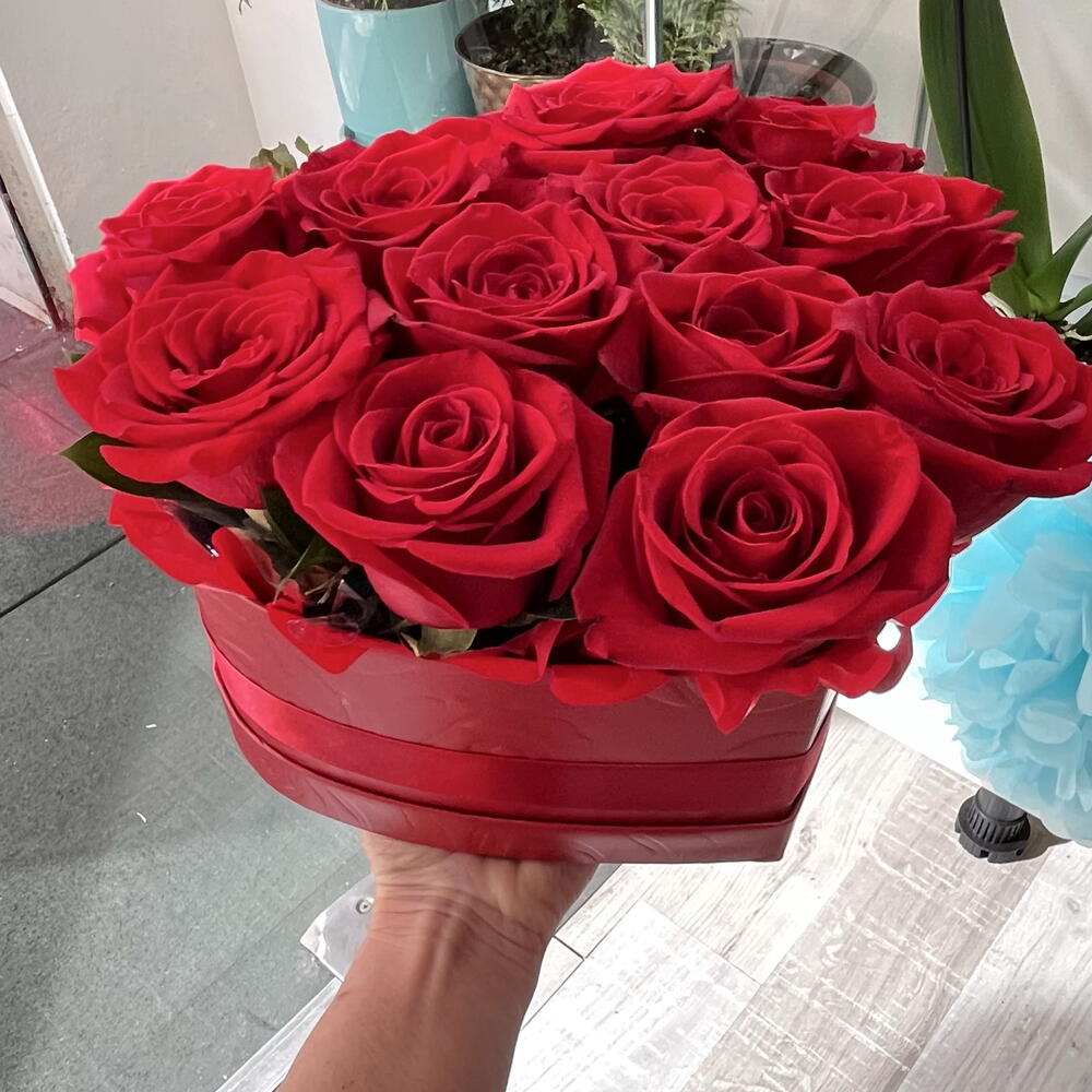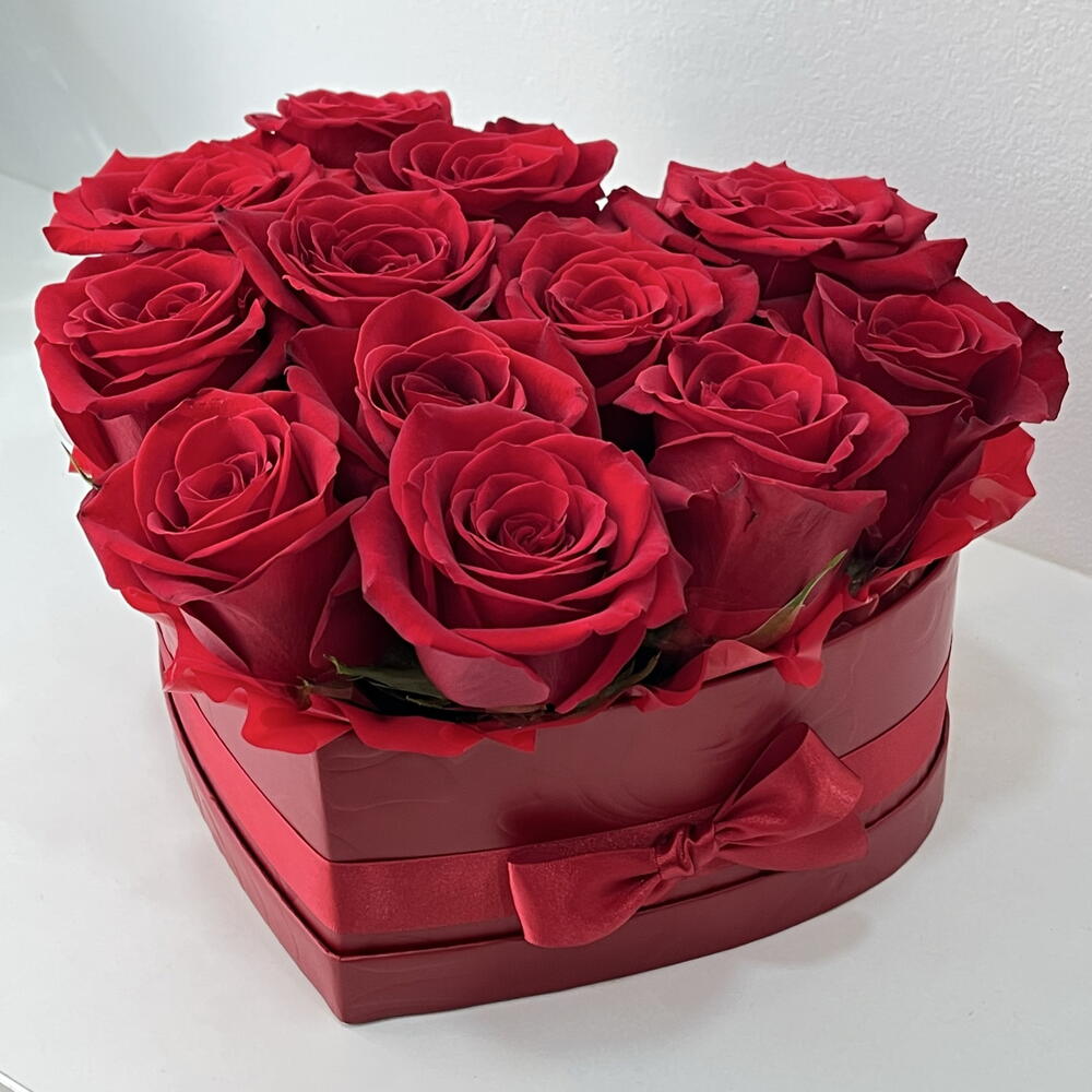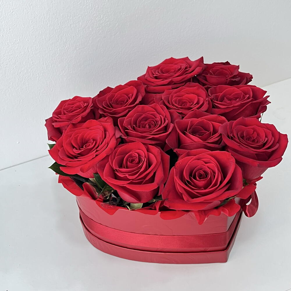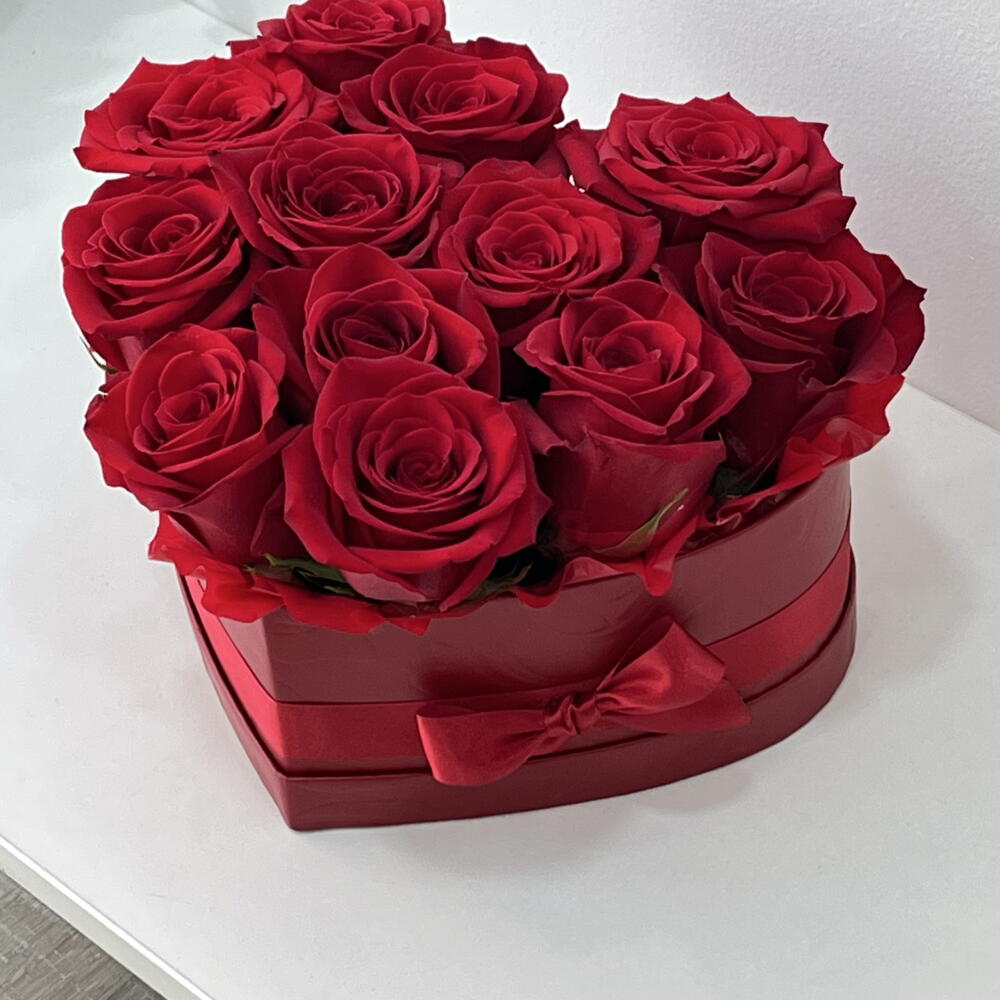 ❤️ Caja roja en forma de corazón con 12 rosas 🌹 La caja en forma de corazón resalta la belleza de 12 rosas frescas, creando un regalo que emociona y se recuerda. Perfecto para decir gracias, te quiero y eres el mejor - sin palabras.