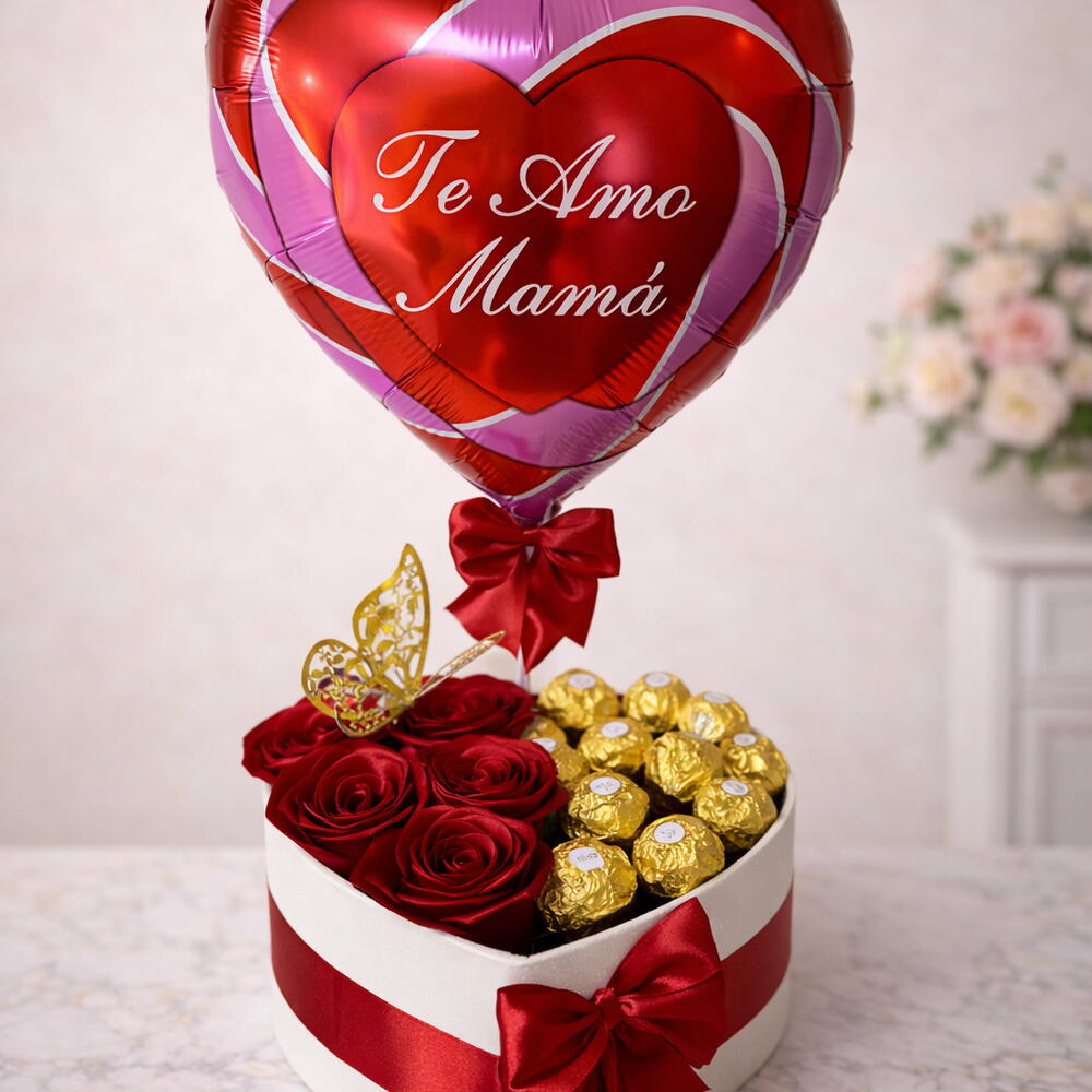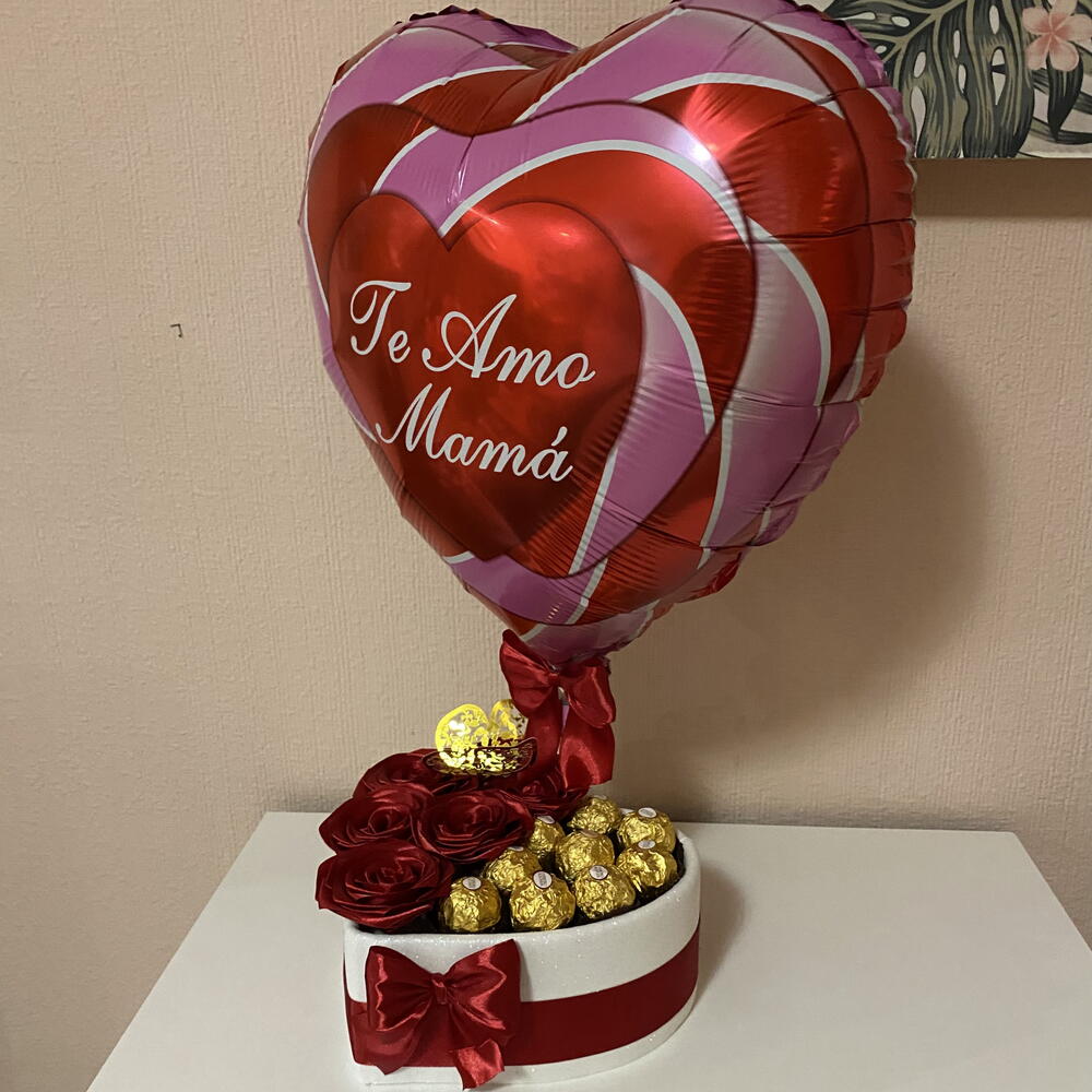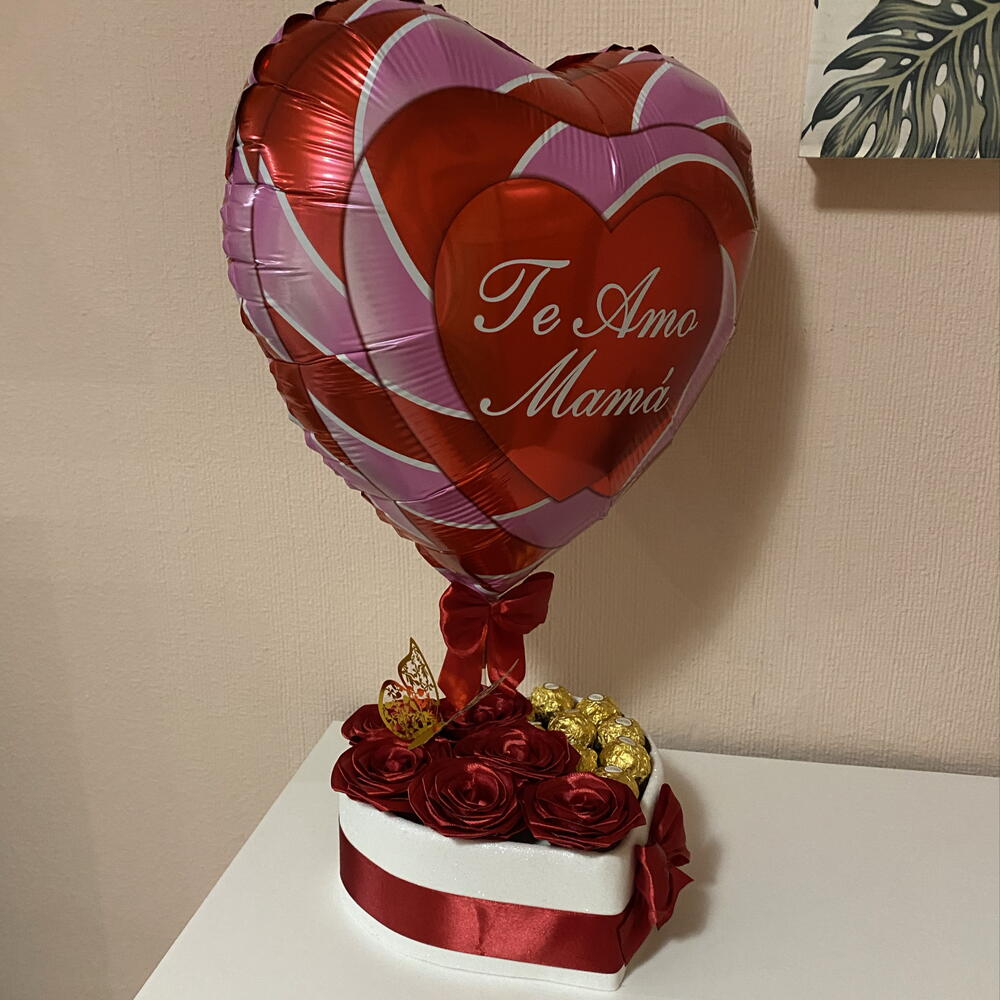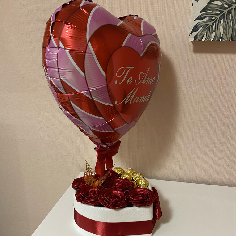 Boîte en forme de cœur pour la Fête des Mères avec roses rouges, Ferrero et ballon Je t'aime Maman - cadeau parfait pour les mamans