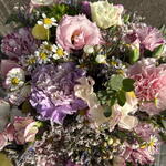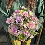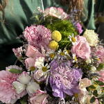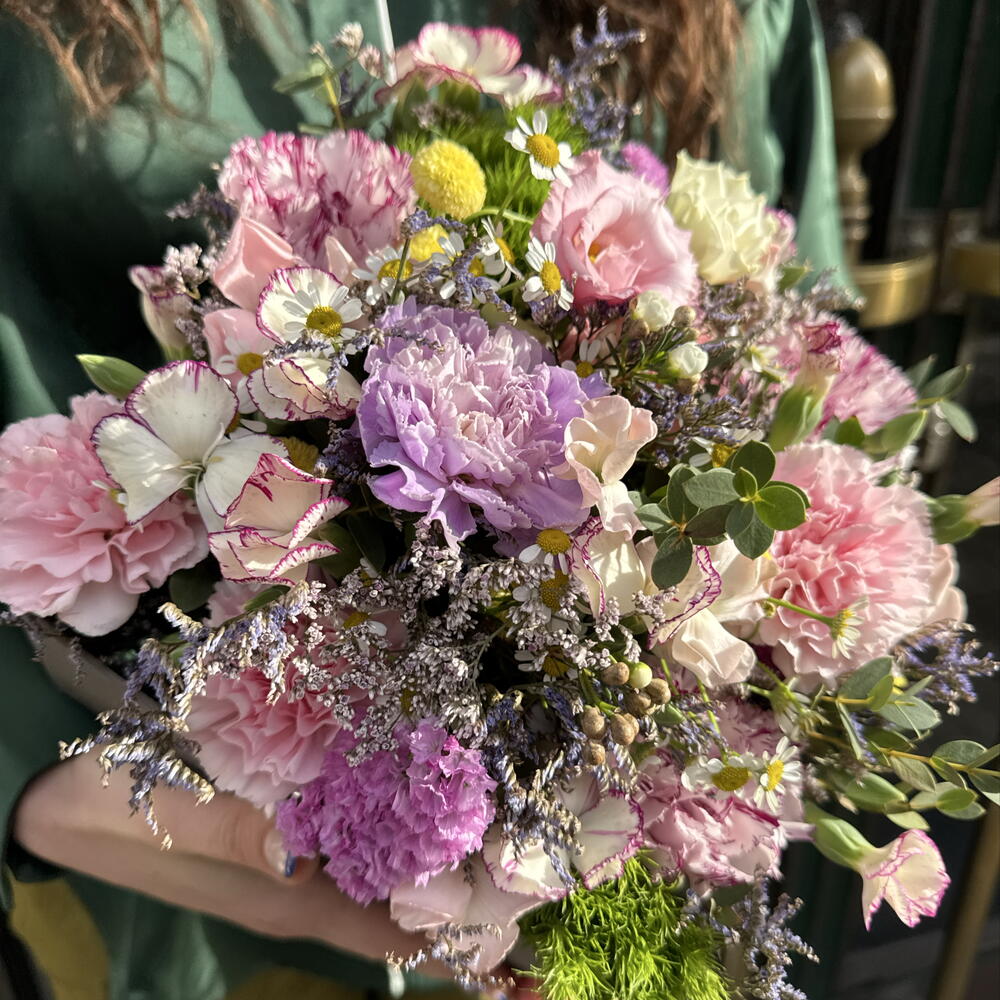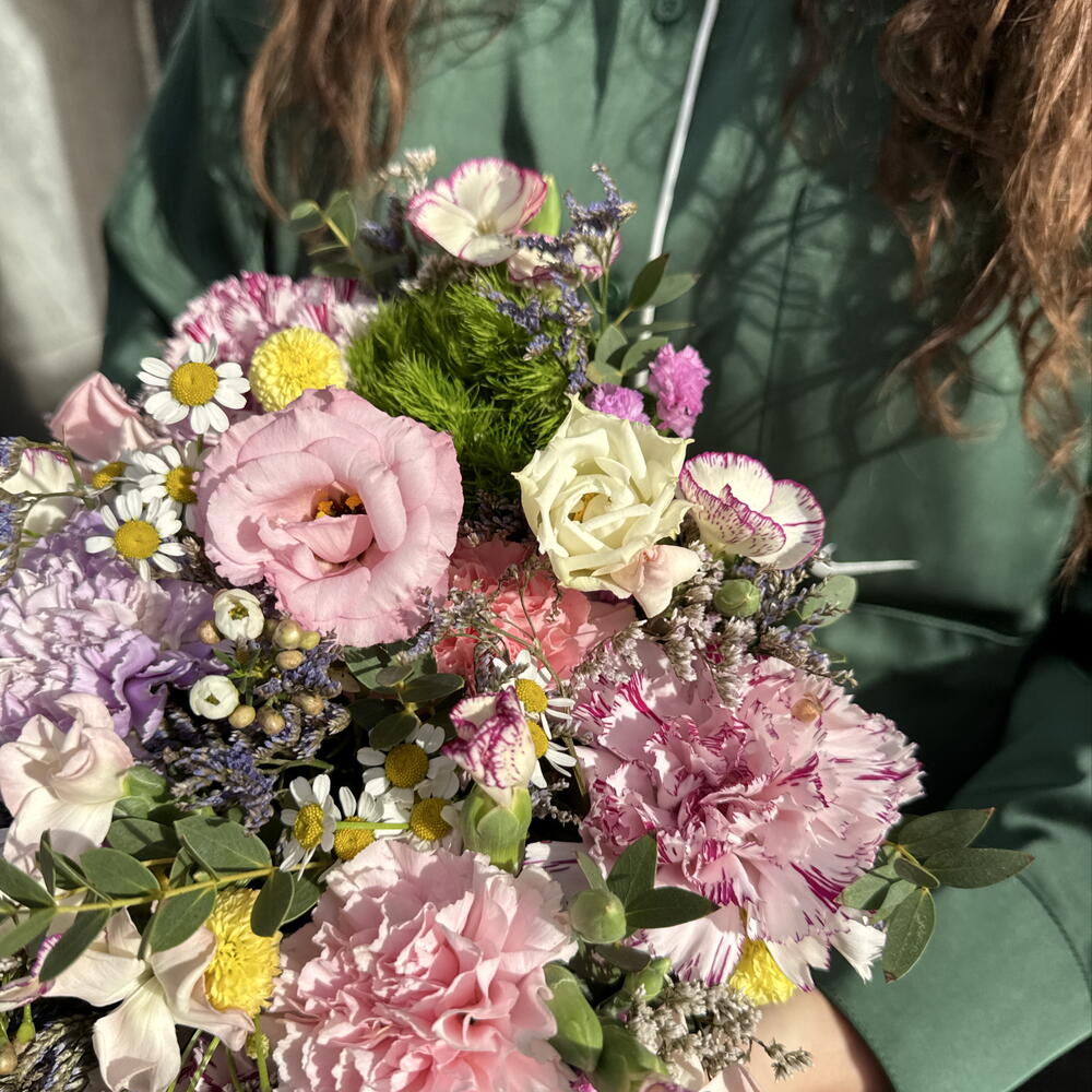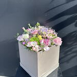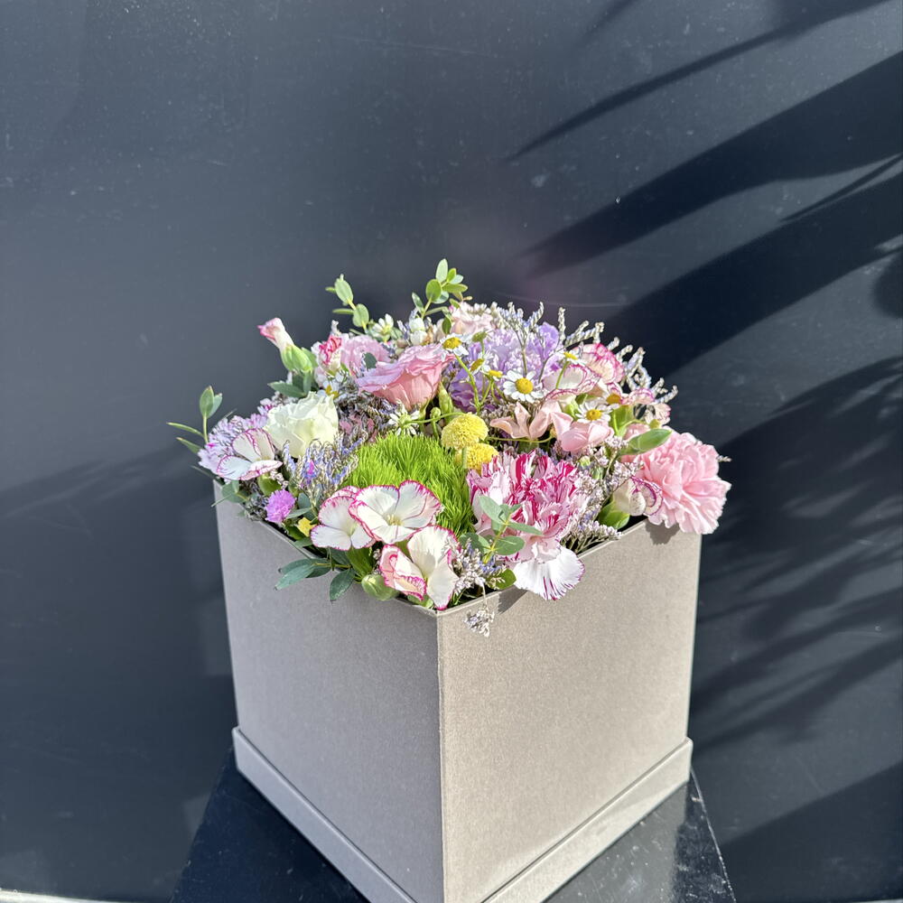 Boîte florale dans des tons pastel avec des œillets, des fleurs sauvages et du feuillage frais. Un détail délicat et élégant, parfait pour offrir en toute occasion.
