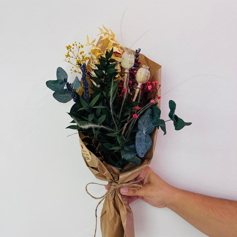 Ce somptueux arrangement de fleurs séchées comprend deux tiges d'eucalyptus, dont le parfum vous transportera au cœur de l'Outback australien. À leurs côtés, deux tiges de lavande séchée délicate apportent une touche provençale à votre intérieur. Deux capsules de pavot séchées évoquent la sérénité des champs sauvages, tandis que deux branches de solidago jaune séché illumineront votre espace des rayons du soleil de fin d'été. Pour parfaire ce magnifique ensemble, trois tiges de paniculata rose séchée lui confèrent une note de douceur et de délicatesse. Cet arrangement floral invite la beauté intemporelle de la nature chez vous.
