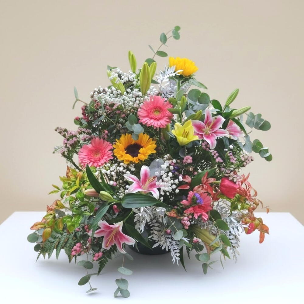 Cet arrangement floral vibrant irradie de joie et de fraîcheur, combinant harmonieusement des couleurs chaudes et délicates. Les gerberas roses et les tournesols apportent une énergie lumineuse, tandis que les lis orientaux ajoutent de l'élégance et un parfum doux. Les tiges délicates de gypsophile créent une atmosphère éthérée, rehaussée par les contrastes de l'eucalyptus argenté et des feuillages verts. Chaque fleur a été sélectionnée avec soin pour former une composition équilibrée et pleine de vie. Idéal pour célébrer des moments spéciaux, transmettre de l'affection ou remplir un espace de couleur et d'harmonie. Pour conserver sa beauté, placez l'arrangement dans un endroit frais, évitez la lumière directe du soleil et changez l'eau tous les deux jours; de plus, recoupez légèrement les tiges pour prolonger sa fraîcheur.