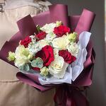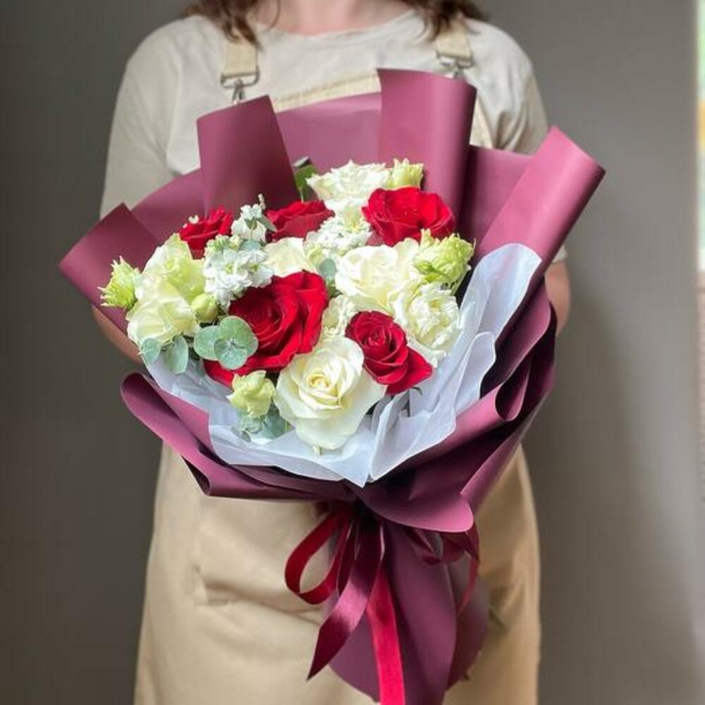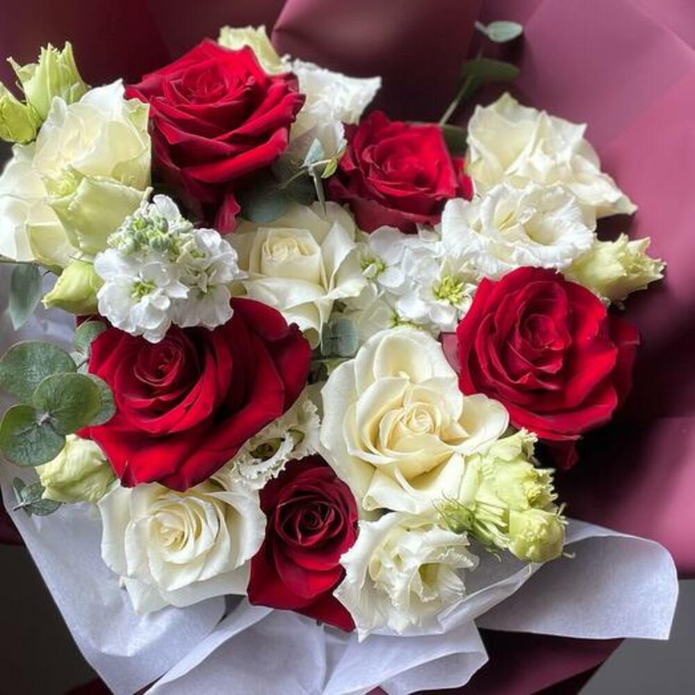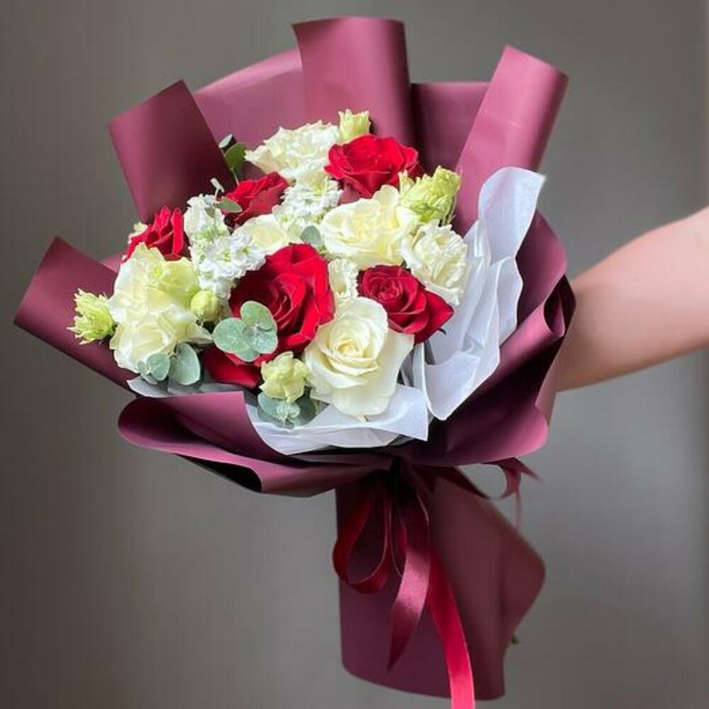 Red rose - 5 pce Eustoma - 2 pce Eucalyptus - 2 pce White rose - 5 pce Wrapping - 2 pce matthiola - 2 pce