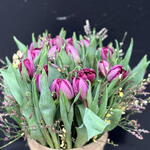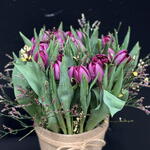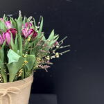 Cesta decorativa con tulipanes lilas en plena frescura, presentada en un envoltorio de yute natural que aporta un estilo rústico y elegante a la vez. Los tulipanes, de tono lila intenso con matices rosados, destacan por sus pétalos firmes y delicadamente cerrados, acompañados de abundante follaje verde que realza su color vibrante.