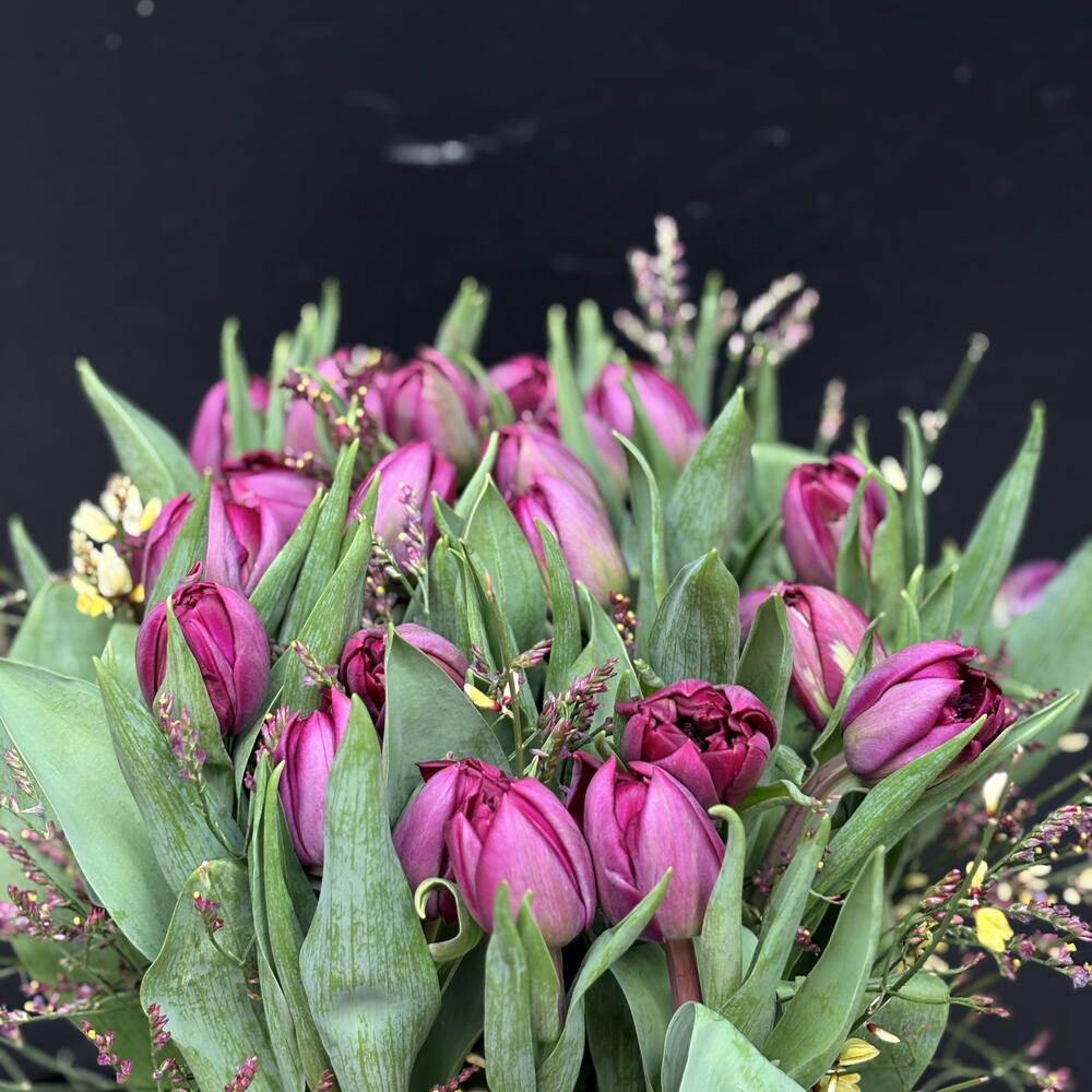 Cesta decorativa con tulipanes lilas en plena frescura, presentada en un envoltorio de yute natural que aporta un estilo rústico y elegante a la vez. Los tulipanes, de tono lila intenso con matices rosados, destacan por sus pétalos firmes y delicadamente cerrados, acompañados de abundante follaje verde que realza su color vibrante.
