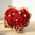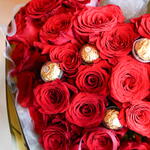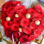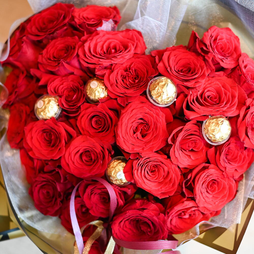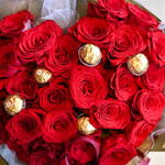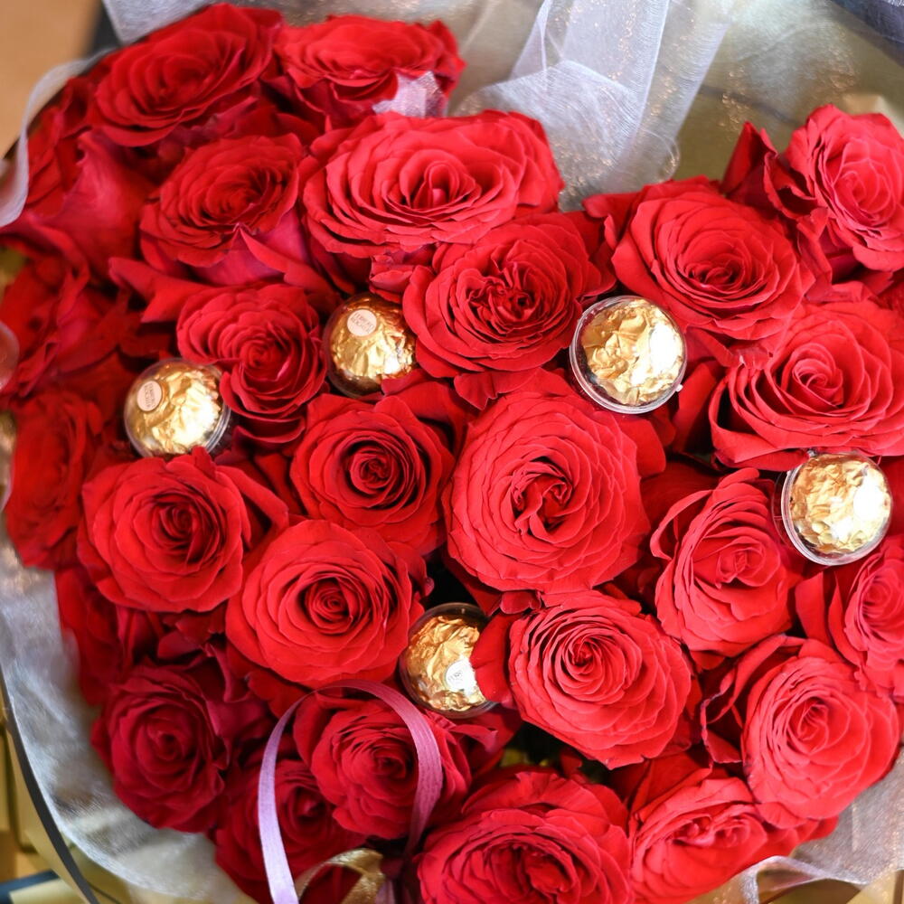 Bouquet cœur de roses haut de gamme. Avec des chocolats Ferrero Rocher, il devient authentiquement délicieux.