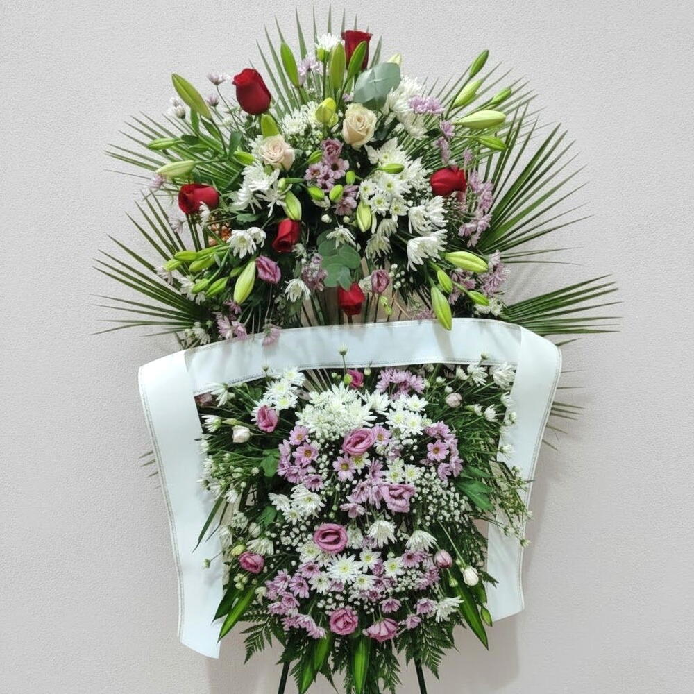 Cette majestueuse composition florale sur pied allie élégance, harmonie et solennité, offrant un hommage parfait aux occasions spéciales. Les roses rouges y apportent une touche d'amour et de respect, tandis que les lys et les chrysanthèmes illuminent l'ensemble de leur pureté et de leur douceur. Les fleurs roses y ajoutent une note délicate et émouvante, créant un équilibre visuel charmant. Grâce à sa composition généreuse et équilibrée, cet arrangement est idéal pour les cérémonies, les inaugurations ou les messages de condoléances. Pour préserver sa fraîcheur, il est recommandé de le placer dans un endroit frais, à l'abri de la lumière directe du soleil, et de vaporiser légèrement les fleurs d'eau. Une composition empreinte de sensibilité et de distinction, conçue pour exprimer les sentiments les plus sincères.