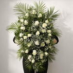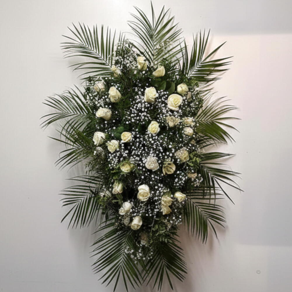 Cet arrangement floral se compose de 30 roses blanches, ajoutant élégance et sérénité à la composition. Complété par 5 paniculatas blanches, qui, par leur délicatesse, apportent une sensation de calme et d'harmonie. Pour donner de la vivacité à l'ensemble, on incorpore 6 feuillages de palmier et 5 de verdure décorative, apportant un contraste de couleur et de fraîcheur qui met en valeur la beauté des roses. Un ornement floral parfait pour exprimer respect, condoléances et soutien dans les moments difficiles.