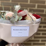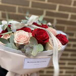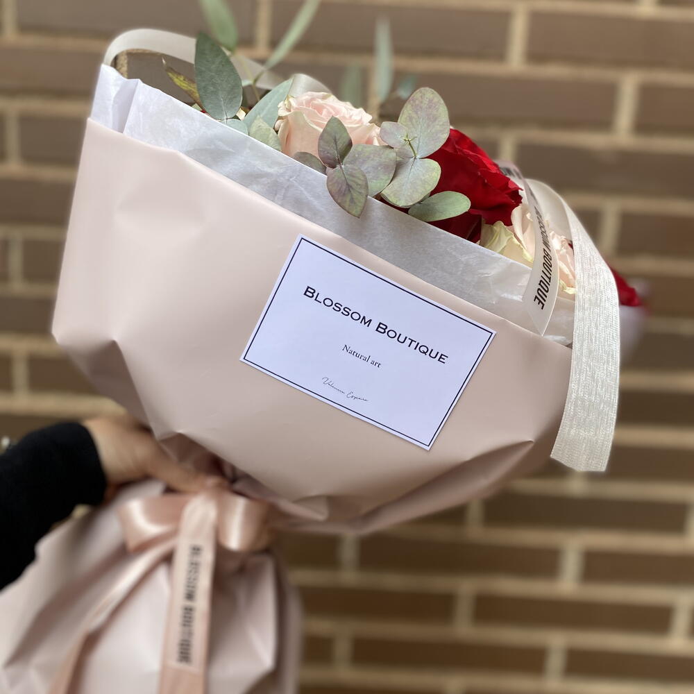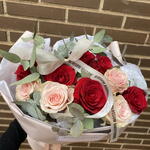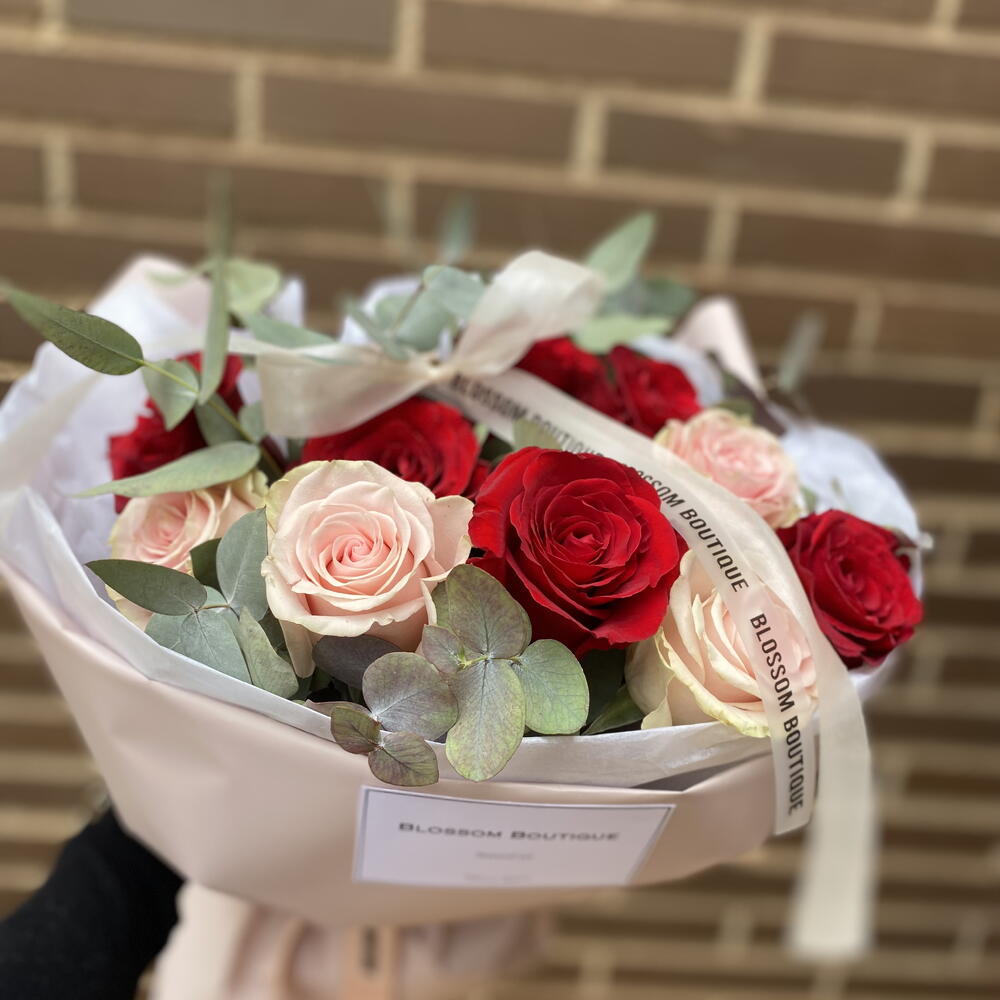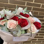 Ce merveilleux bouquet classique est composé d'un délicat mélange de 12 belles roses rouges et roses et de 6 unités d'eucalyptus cinerea rafraîchissant. Enveloppé dans un élégant papier floral rose pâle imperméable et, de plus, protégé par deux feuilles de papier de soie blanc fin, ce bouquet saisit le romantisme et l'élégance. Complété par 1,20 cm de rubans décoratifs, ce bouquet est le choix parfait pour exprimer vos sentiments les plus profonds et sincères.