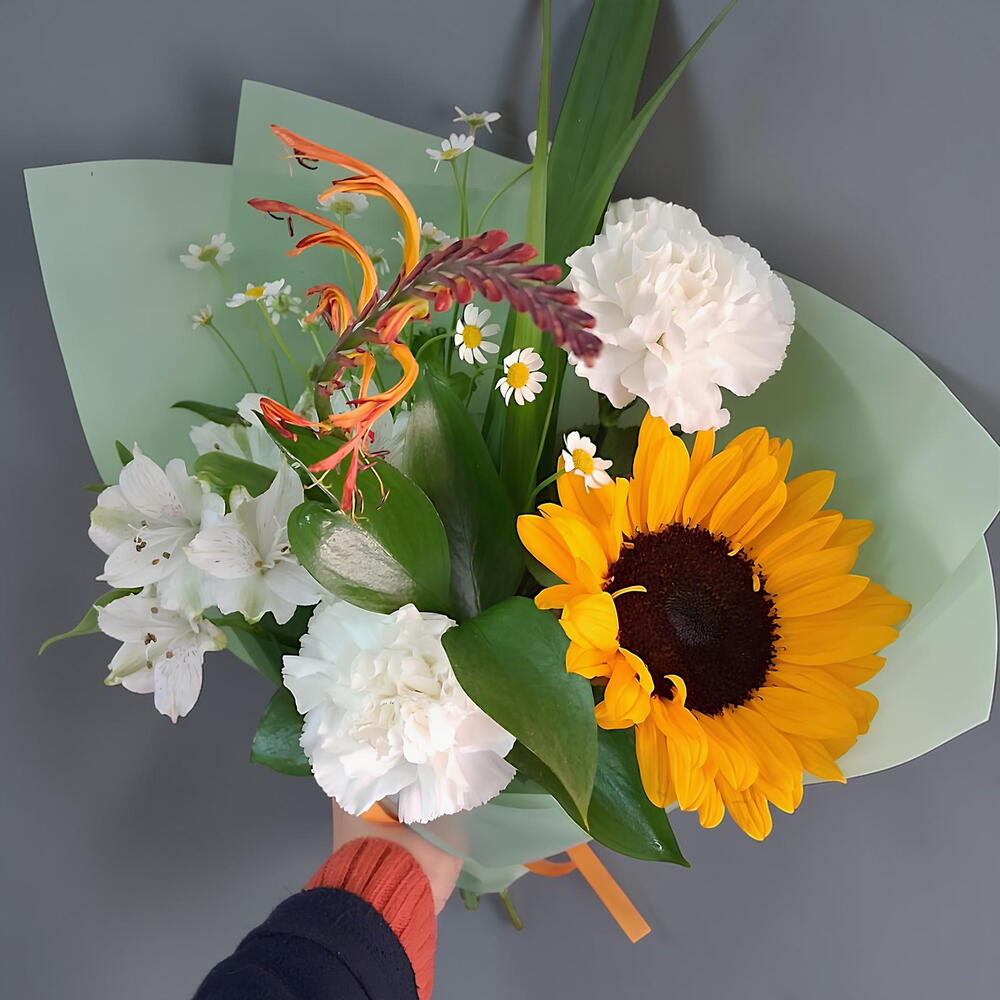 Ruscus - 1 pce Alstroemeria - 1 pce tanacetum - 1 pce tournesol - 1 pce papier - 2 pce œillet colombien - 2 pce