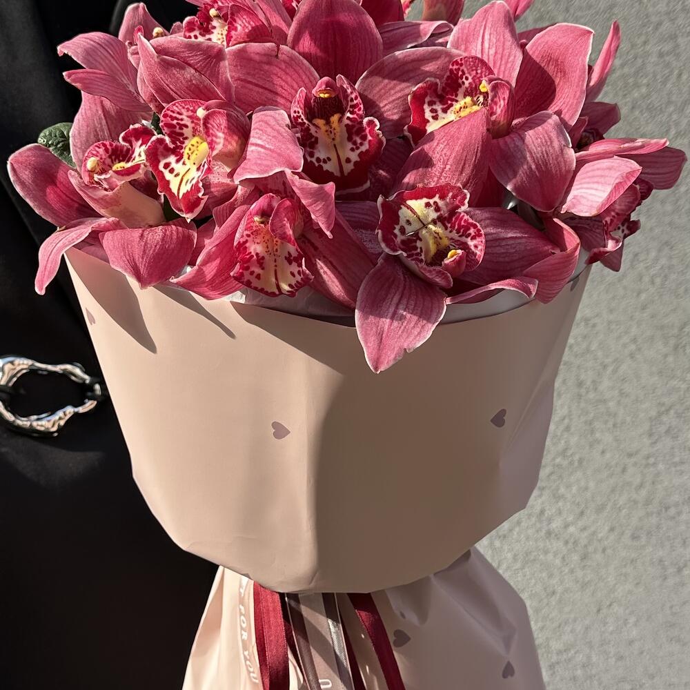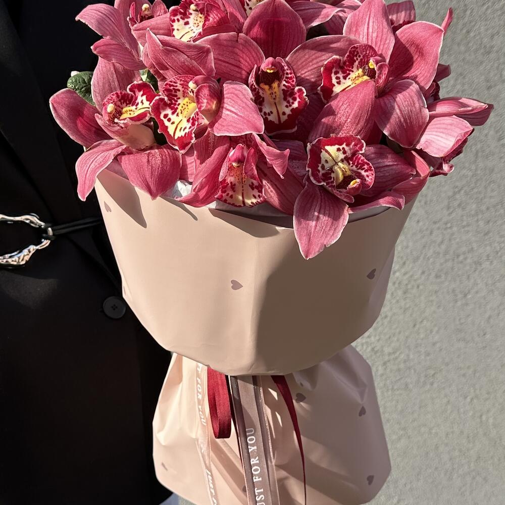 Bouquet mono d'orchidées. La couleur de la fleur peut être choisie individuellement. Disponible en blanc, 3 nuances de rose, rouge et vert. Vous pouvez aussi combiner 2 couleurs