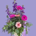Gerbera - 6 pce eucalyptus - 4 pce statice lilas - 3 pce vert décoratif - 3 pce gypsophila blanche - 2 pce matthiola lilas - 4 pce
