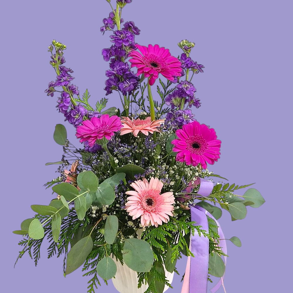 Gerbera - 6 pce eucalyptus - 4 pce statice lilas - 3 pce vert décoratif - 3 pce gypsophila blanche - 2 pce matthiola lilas - 4 pce