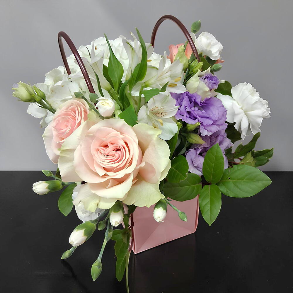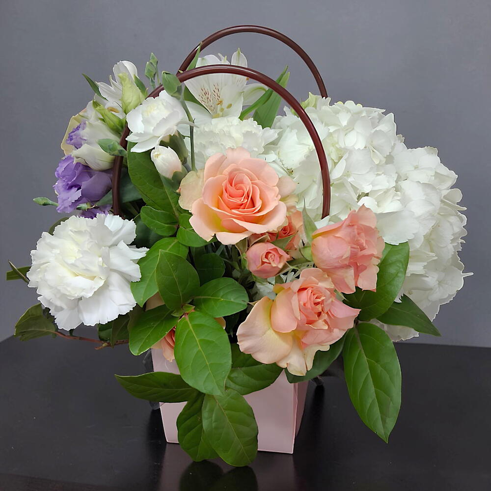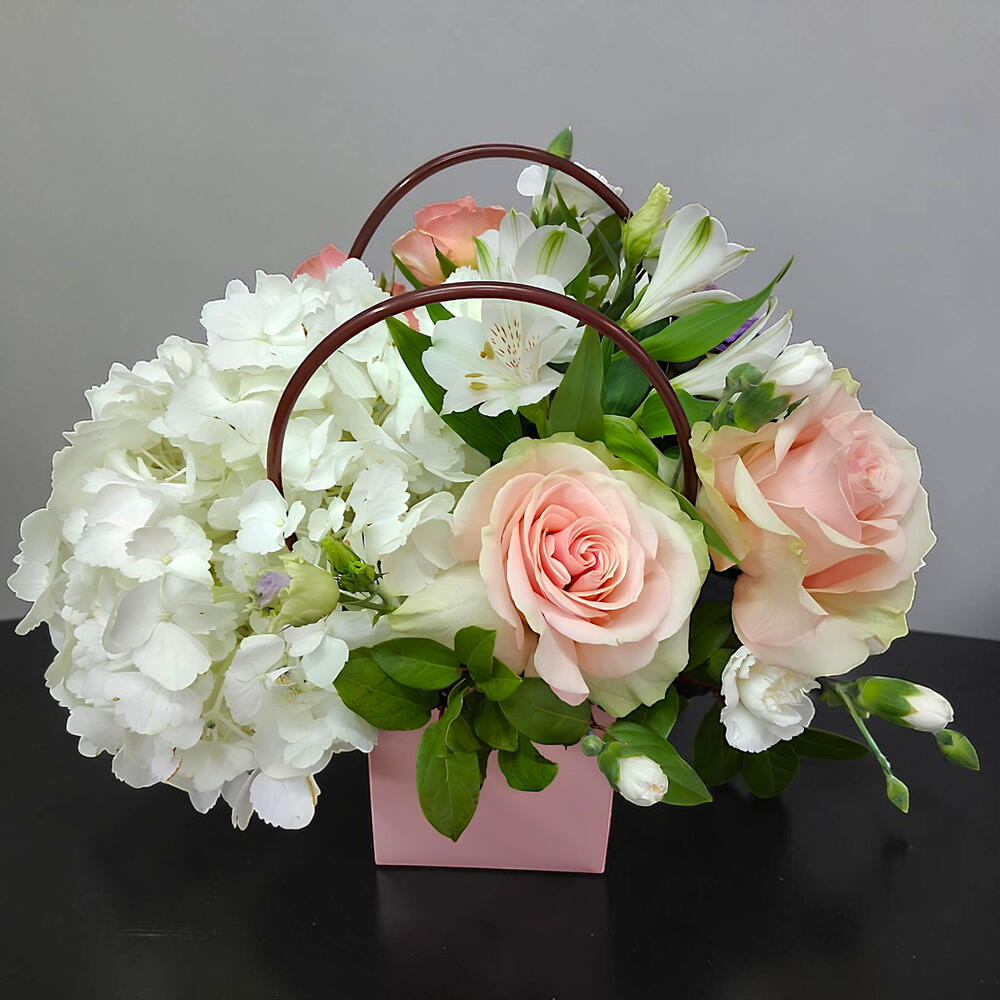 alstroemeria white - 1 pce rosa spray - 1 pce lisiantus - 1 pce œillet colombien - 2 pce hortensia blanca - 1 pce mini œillet colombien - 2 pce Oasis Classique Brique 35 23X11X8Cm - 1 pce rose rose pâle Équateur - 2 pce boîte en forme de sac - 1 pce