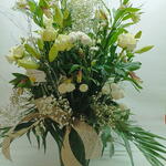 Ce ravissant arrangement floral signature met en scène une sélection exquise de 5 lisianthus couleur crème, apportant une douce délicatesse à l'ensemble. Il comprend 5 chrysanthèmes pompon blancs, réputés pour leur élégance immaculée, ainsi que 10 alstroemères blanches, ajoutant une touche d'exotisme. Le centre est une magnifique composition de 6 lys blancs, exhalant un parfum subtil et rafraîchissant. Celle-ci est complétée par 10 feuilles d'eucalyptus, apportant une touche de verdure naturelle, et ornée de 5 tiges de gypsophile, connues pour leur beauté délicate. Enfin, 10 branches de leder viennent parfaire l'ensemble, ajoutant texture et volume. Toutes ces fleurs sont harmonieusement disposées dans un élégant vase en cristal pour une finition luxueuse. Cet arrangement floral constitue un cadeau idéal, qui ne manquera pas d'impressionner par son association raffinée de fleurs d'exception.