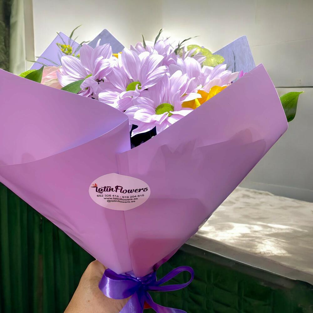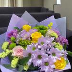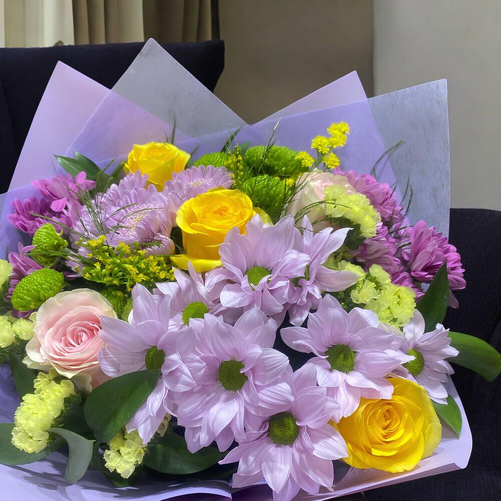 Solidago - 2 pce roses roses - 2 pce roses jaunes - 3 pce statice jaune - 2 pce chrysanthèmes verts - 2 pce marguerites lilas - 2 pce chrysanthèmes violets - 2 pce