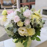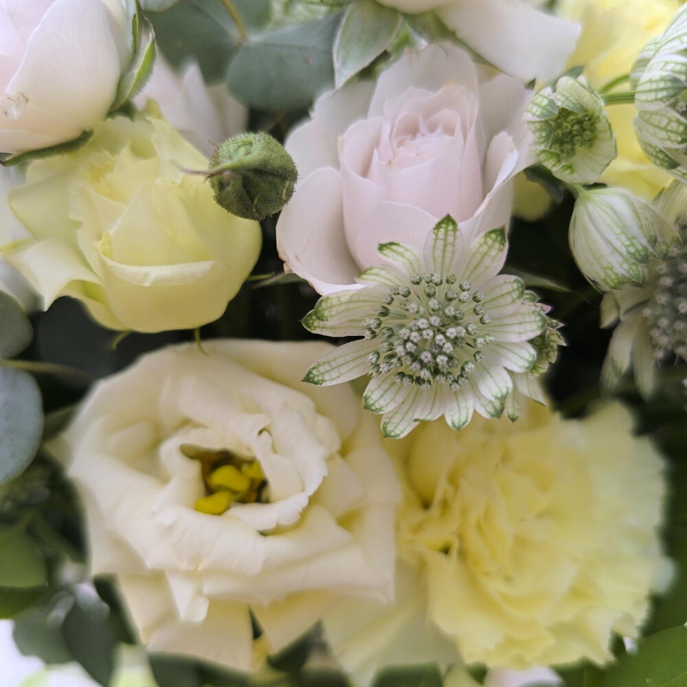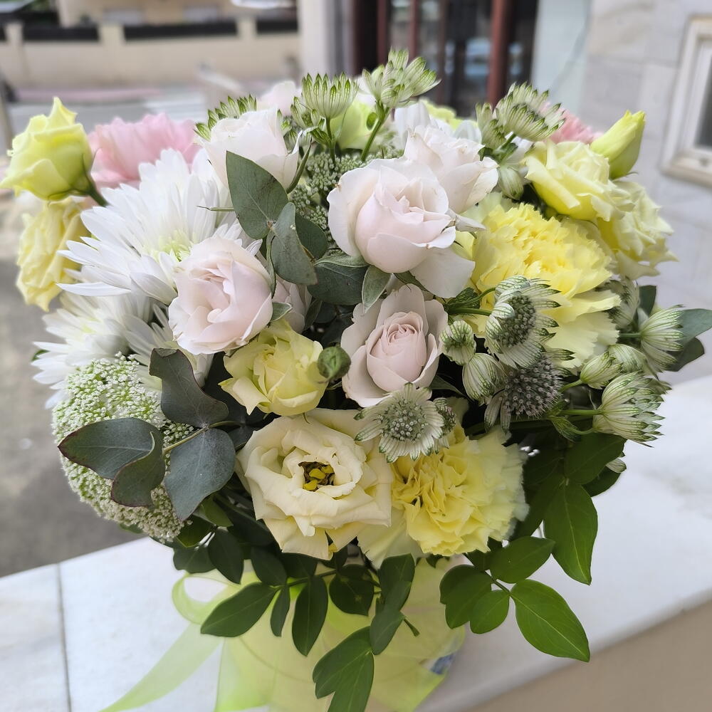 Eucalyptus - 5 pce flower box - 1 pce white spray rose - 3 pce yellow lisianthus - 2 pce œillets jaunes - 5 pce astrantia verte - 4 pce chrysanthèmes blancs - 2 pce