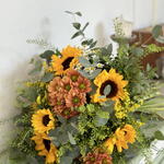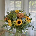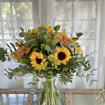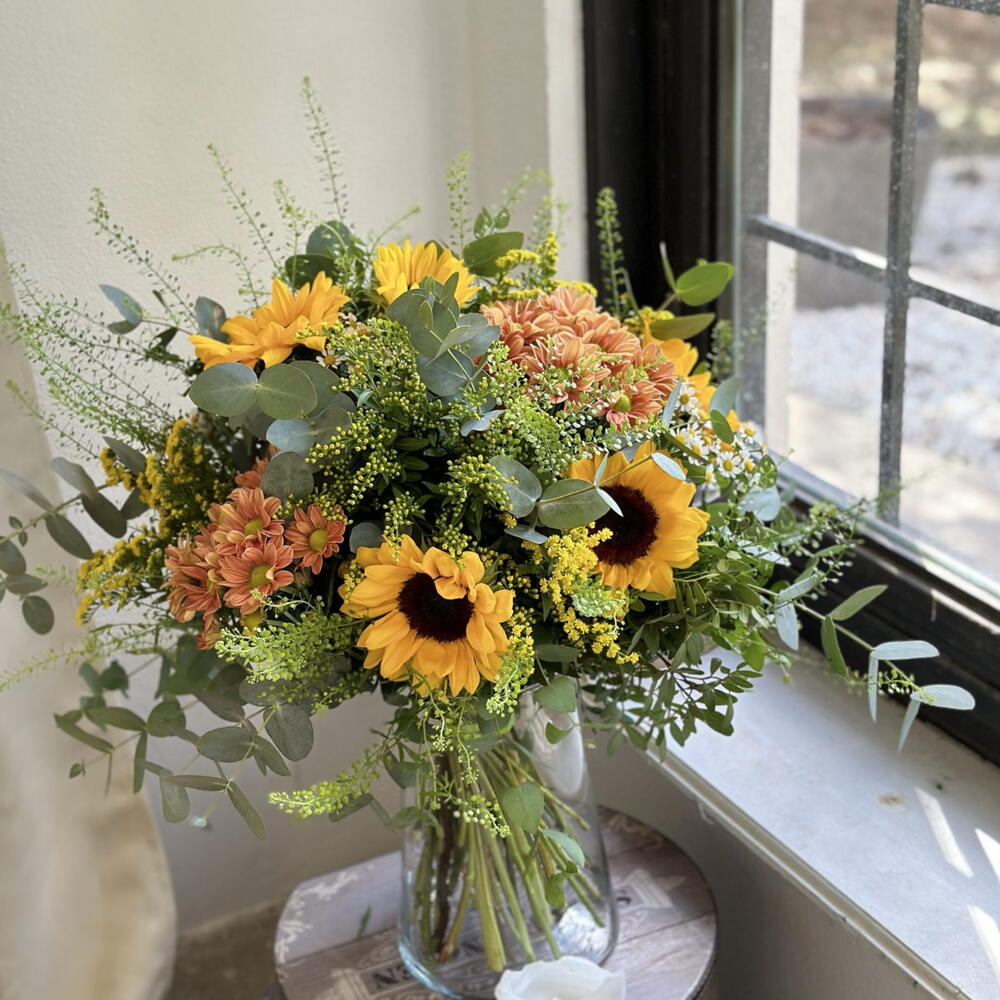 eucalyptus - 5 pce chrysanthème - 4 pce vase - 1 pce bouquet de tournesols - 7 pce feuillage ornemental - 3 pce