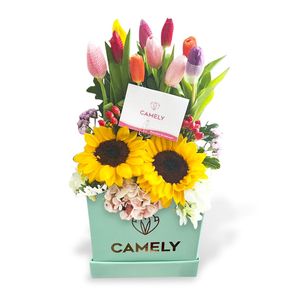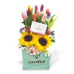 Jolie boîte de couleur variable selon le stock. Inclut une décoration avec 10 tulipes (d'une seule couleur) et des tournesols. Boîte avec une composition de tulipes et de tournesols frais, conçue pour transmettre lumière et énergie. La combinaison idéale de couleurs vibrantes pour offrir de la joie à toute occasion spéciale.