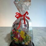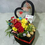 Este encantador arreglo está compuesto por un corazón negro con tres rosas rojas y margaritas amarillas que aumentan su atractivo. Cuenta con una variedad de golosinas: 8 Ferrero, 6 Baci, 3 Mini Twix, 1 Mini Kitkat y 1 Mini Mars, ideales para satisfacer el antojo de cualquier amante de los dulces. También incluye 1 topper y 1 tarjeta dedicatoria para personalizar su regalo. Embellecido con 2 mariposas ornamentales y 1 follaje que le dan un toque elegante, este corazón es el regalo perfecto para cualquier ocasión.