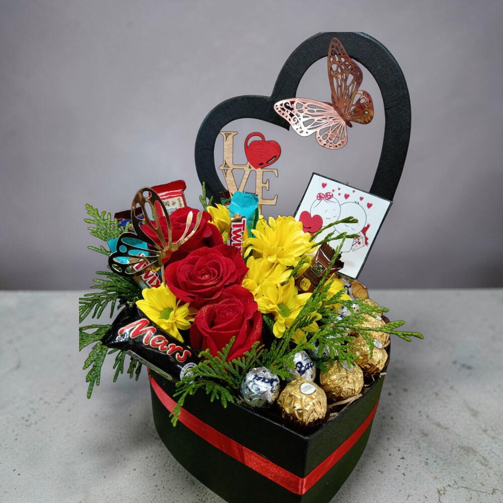Este encantador arreglo está compuesto por un corazón negro con tres rosas rojas y margaritas amarillas que aumentan su atractivo. Cuenta con una variedad de golosinas: 8 Ferrero, 6 Baci, 3 Mini Twix, 1 Mini Kitkat y 1 Mini Mars, ideales para satisfacer el antojo de cualquier amante de los dulces. También incluye 1 topper y 1 tarjeta dedicatoria para personalizar su regalo. Embellecido con 2 mariposas ornamentales y 1 follaje que le dan un toque elegante, este corazón es el regalo perfecto para cualquier ocasión.