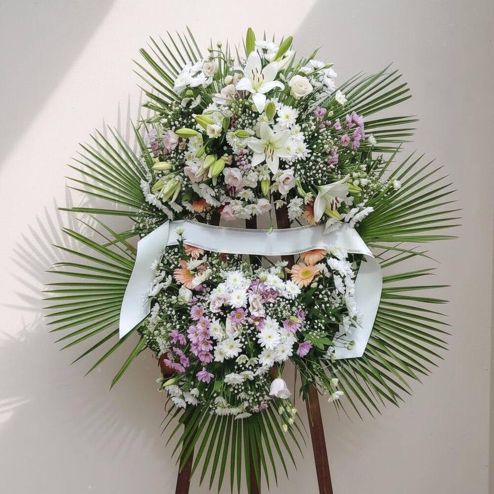 Ce majestueux arrangement floral sur pied se distingue par son élégance et son harmonie, mêlant des fleurs aux nuances de blanc, de rose et de lilas qui évoquent sérénité et respect. Ses deux niveaux créent une composition équilibrée et volumineuse, idéale pour exprimer ses condoléances ou accompagner des moments importants d'une touche solennelle et délicate. Les lys blancs symbolisent la pureté, tandis que les marguerites et les chrysanthèmes apportent douceur et fraîcheur à l'ensemble. Des touches de gerberas pastel et de lisianthus roses offrent une teinte chaleureuse et accueillante, harmonieusement contrebalancée par un fond de feuilles de palmier luxuriantes. Pour préserver la fraîcheur de cet arrangement, il est conseillé de le placer dans un endroit frais, à l'abri du soleil direct, et de vaporiser légèrement les fleurs d'eau tous les un ou deux jours. Retirer délicatement les fleurs fanées contribuera à prolonger sa beauté.