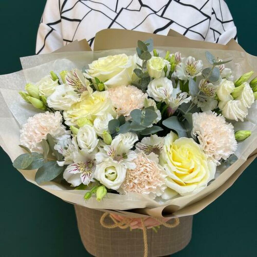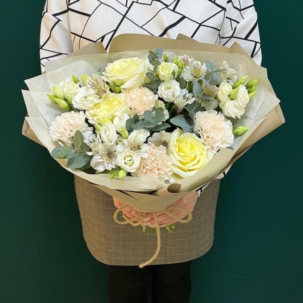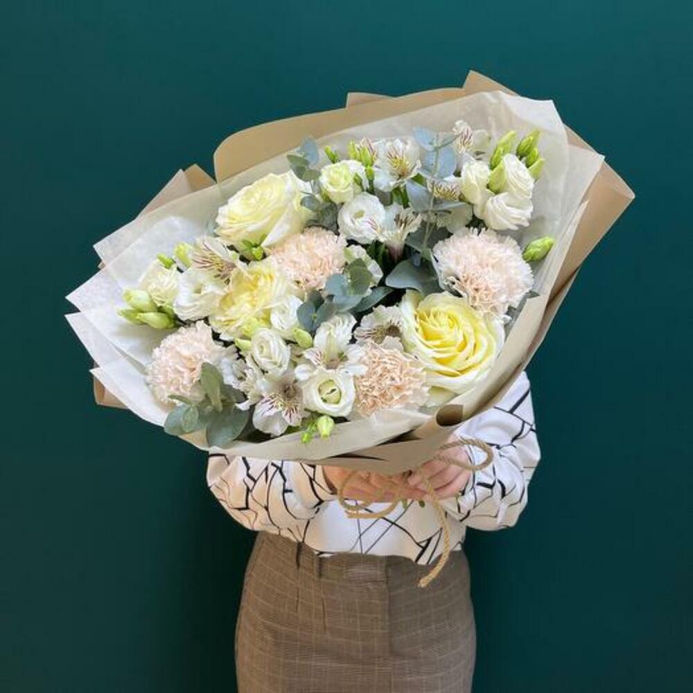 Cet merveilleux arrangement floral est composé de 7 majestueuses roses blanches, de 5 branches d'eucalyptus et de 5 charmantes alstroemères blanches, qui ensemble créent une atmosphère fraîche et sereine. Cette pièce inclut également 5 fabuleuses fleurs dianthus couleur crème, qui ajoutent une touche subtile de couleur et de chaleur à l'ensemble. Pour rester fidèle au style naturel et rustique, l'arrangement est présenté enveloppé dans une feuille de kraft et délicatement attaché avec une corde. Sans aucun doute, cet arrangement est un cadeau provenant de la mère nature, travaillé avec art et amour. *La couleur des fleurs peut varier selon le stock