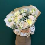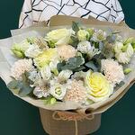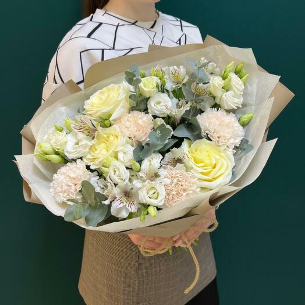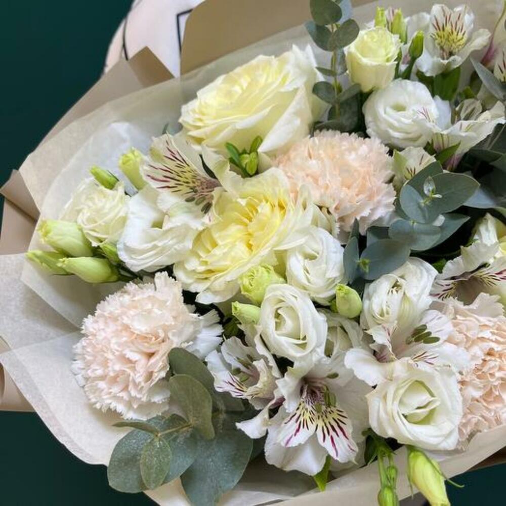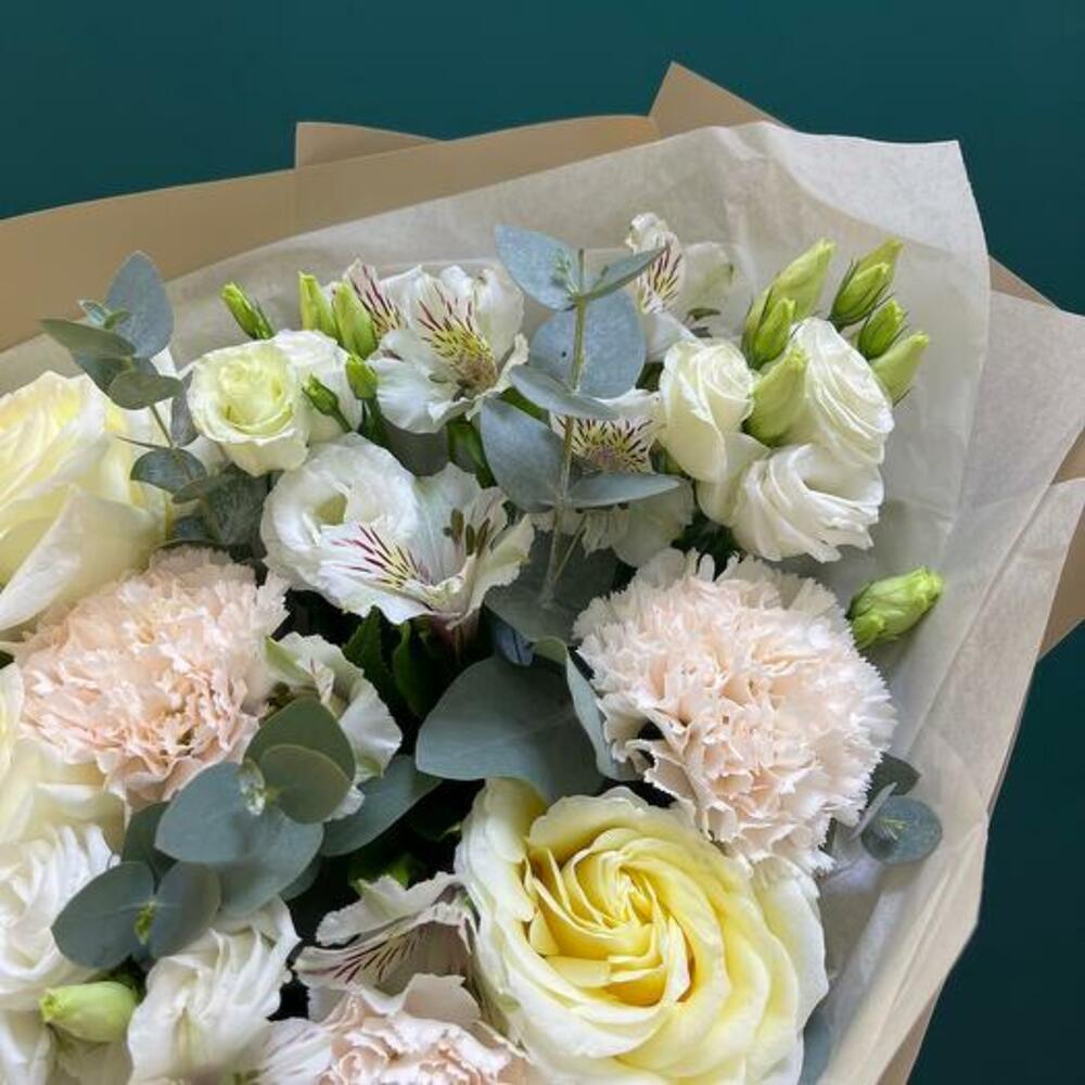Eucalyptus - 5 pce alstroemère blanche - 5 pce rose blanche - 7 pce œillet crème - 5 pce kraft wrapping - 1 pce corde - 1 pce