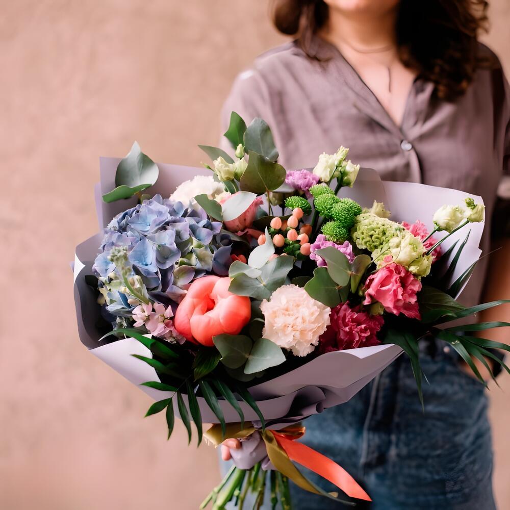 Ce magnifique bouquet combine une variété de fleurs aux tons doux et vibrants, idéal pour exprimer joie et fraîcheur. Avec des hortensias, des œillets et des touches de fleurs exotiques, il est parfait pour les anniversaires, les célébrations spéciales ou simplement pour remplir de vie n'importe quel espace. L'harmonie de ses couleurs et la diversité des textures créent une composition visuellement charmante, pleine de style et d'élégance.