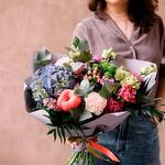Eustoma - 5 pce hortensia - 1 pce hypericum - 3 pce eucalyptus - 3 pce chrysanthème - 3 pce clavel - 4 pce pivoine - 1 pce