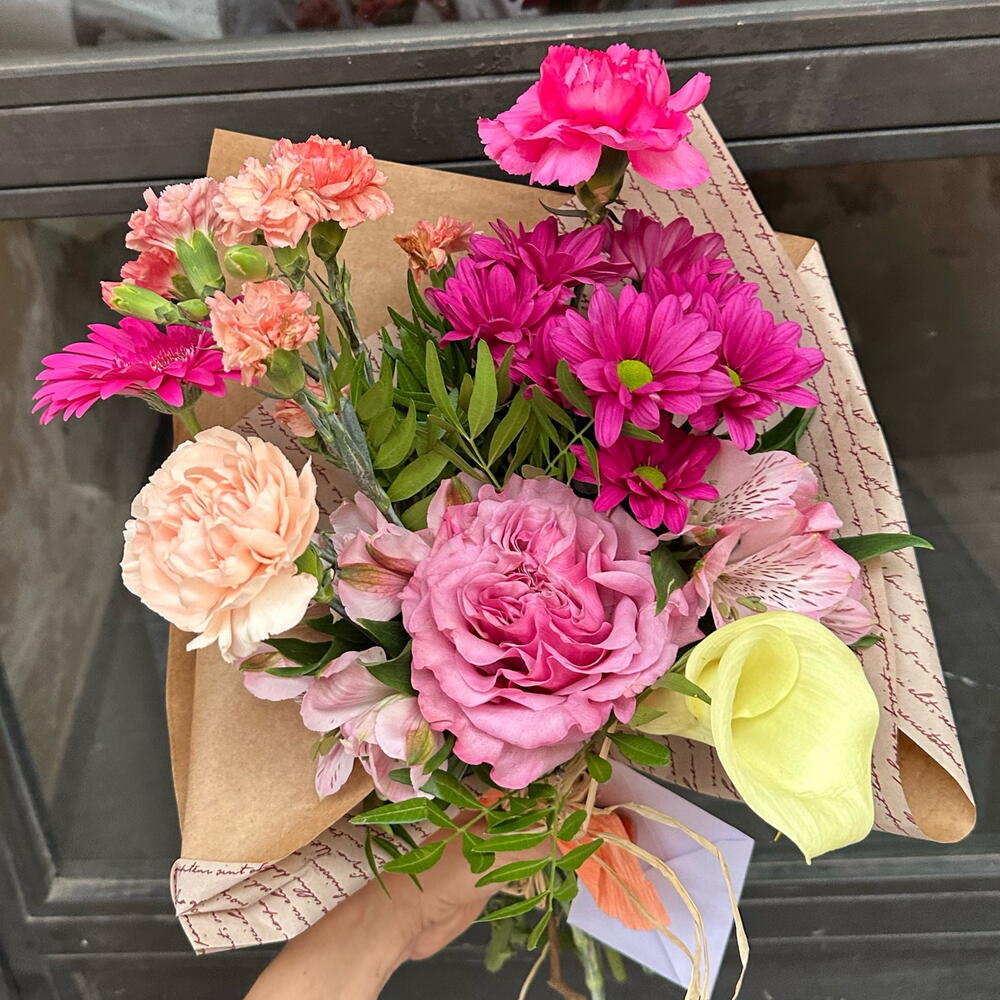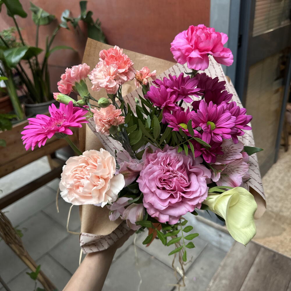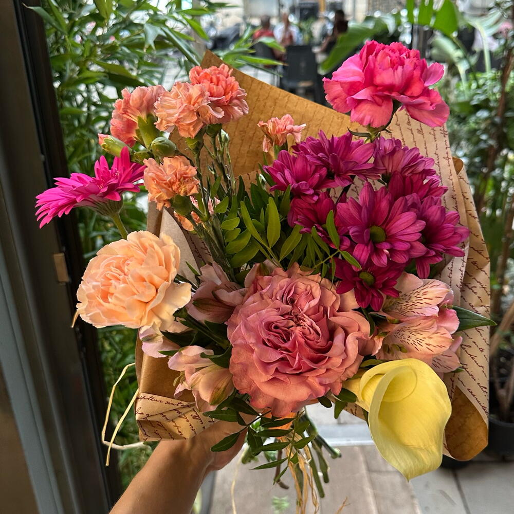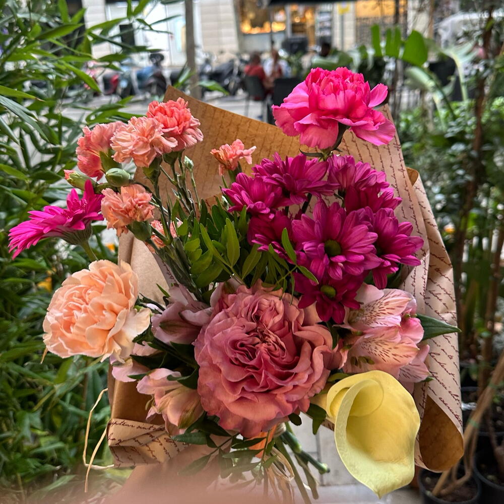 Gerbera - 1 pce clavel - 2 pce rose de jardin - 1 pce lentisque - 3 pce mini œillet - 2 pce croissants Bimbo - 1 pce