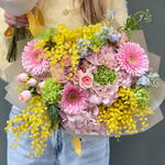 hortensia - 2 pce Gerbera - 3 pce delphinium - 3 pce mimosa - 2 pce clavel - 5 pce rose mini - 3 pce