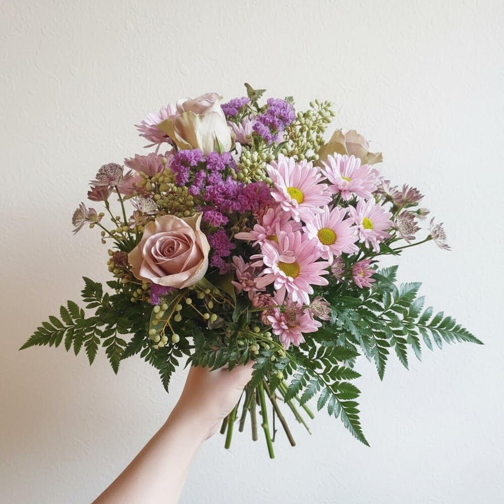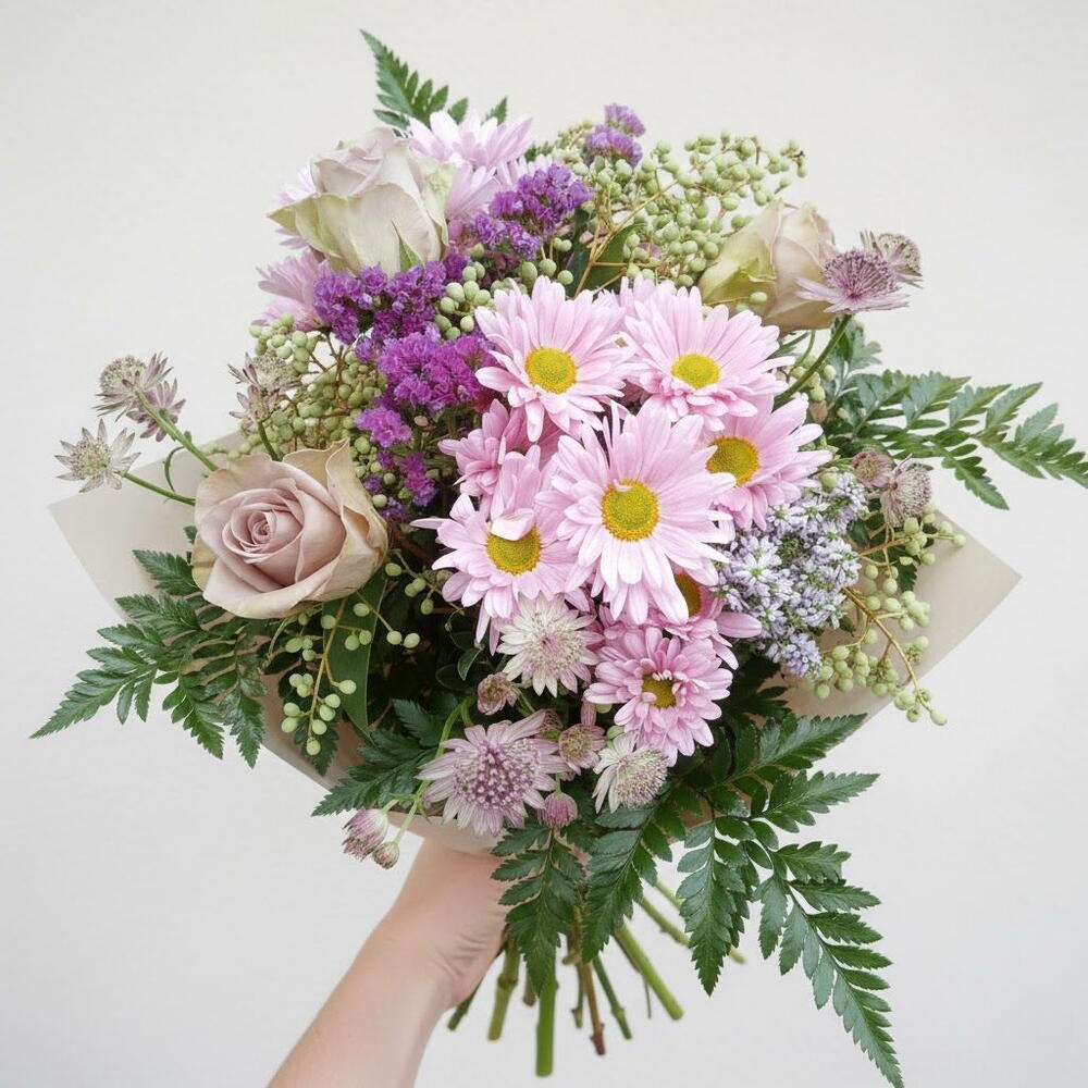 Este delicado ramo destaca por su encanto natural, combinando tonos suaves de rosa, lavanda y verde en una composición armoniosa y romántica. Las flores silvestres y las margaritas rosadas añaden frescura y ligereza, mientras que las rosas en tonos nude aportan elegancia y un toque sofisticado. El follaje abundante crea una sensación de volumen y textura, haciendo que el ramo luzca exuberante pero delicado a la vez. Es perfecto para cumpleaños, aniversarios, agradecimientos, celebraciones íntimas o simplemente para alegrar el día de alguien especial. Para mantener el ramo fresco, colócalo en agua limpia y fresca inmediatamente después de recibirlo. Corta los tallos 1–2 cm cada día y retira las hojas que queden por debajo del nivel del agua. Evita la luz solar directa y las fuentes de calor para prolongar su belleza durante varios días.