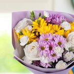 Ce charmant bouquet classique comprend trois élégantes roses blanches, deux marguerites jaunes revitalisantes et deux marguerites roses pleines de douceur, méticuleusement accentuées par cinq œillets buissonnants. Le tout est présenté délicatement dans deux emballages décoratifs qui en embellissent la présentation, créant un arrangement floral beau et classique. Une option parfaite pour toute occasion.
