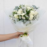 Ce majestueux bouquet d'auteur associe 15 roses blanches de haute qualité à 7 délicates roses spray blanches pour créer une harmonieuse symphonie de blancheur. Sublimée par 6 alstroemères blanches et fraîches, 6 tiges de gypsophile éthérées et 6 branches d'eucalyptus aromatique, cette composition florale est une véritable déclaration d'élégance et de sophistication. Enfin, 4 éléments de verdure décorative ajoutent une touche de naturel et de fraîcheur à cette impressionnante composition florale. Un choix parfait pour ceux qui souhaitent exprimer des sentiments profonds d'amour, de respect et d'admiration avec un bouquet véritablement exceptionnel.
