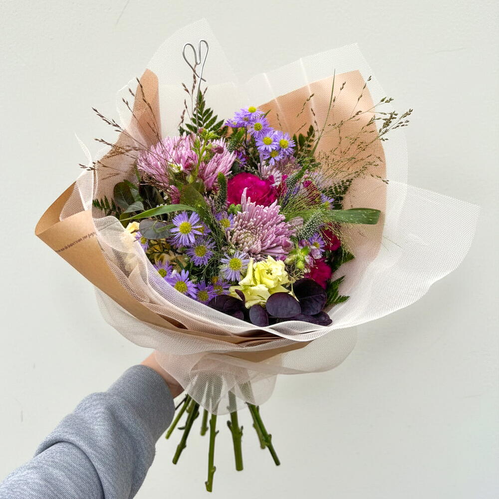 helecho - 3 pce rose fuchsia - 2 pce aster violet - 6 pce lisianthus crème - 2 pce chrysanthème spider lilas - 4 pce feuilles d'eucalyptus rouge - 2 pce graminées décoratives - 3 pce