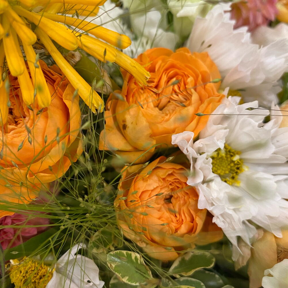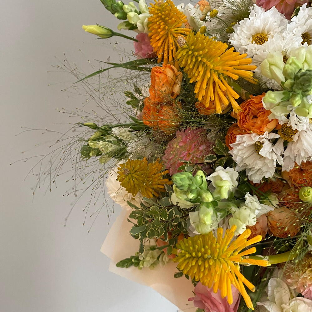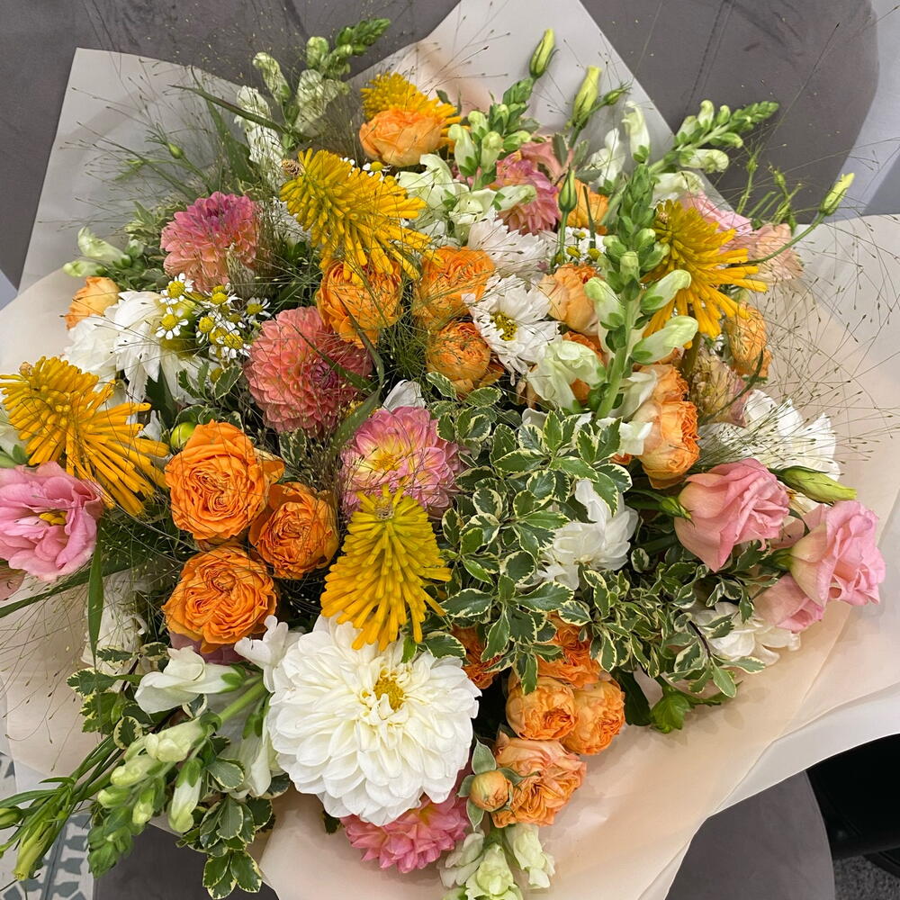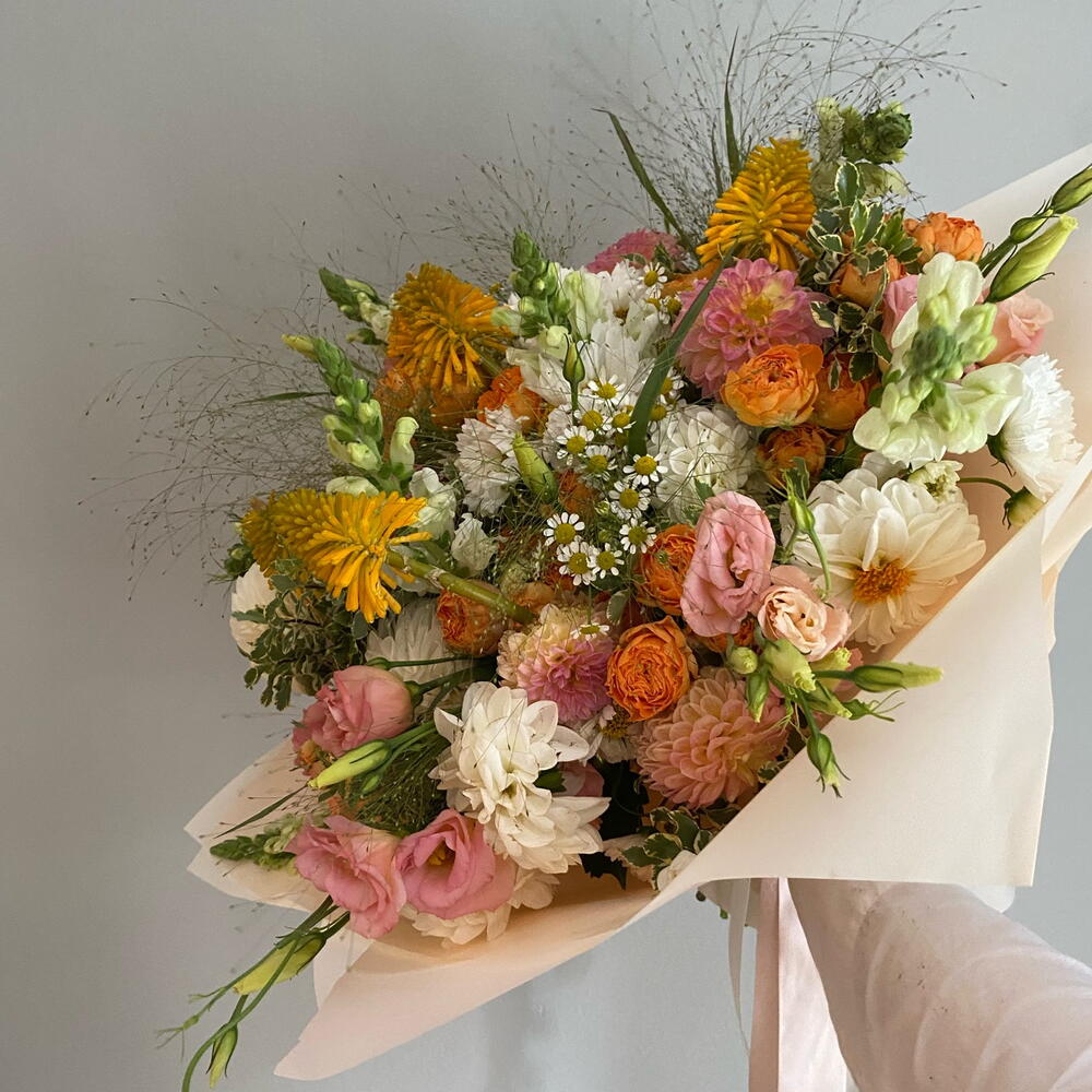 Spray rose - 10 pce Lisianthus - 5 pce cosmos - 5 pce antirrinum - 5 pce pittosporum - 5 pce panicum - 10 pce kniphofia - 5 pce dhalias - 9 pce