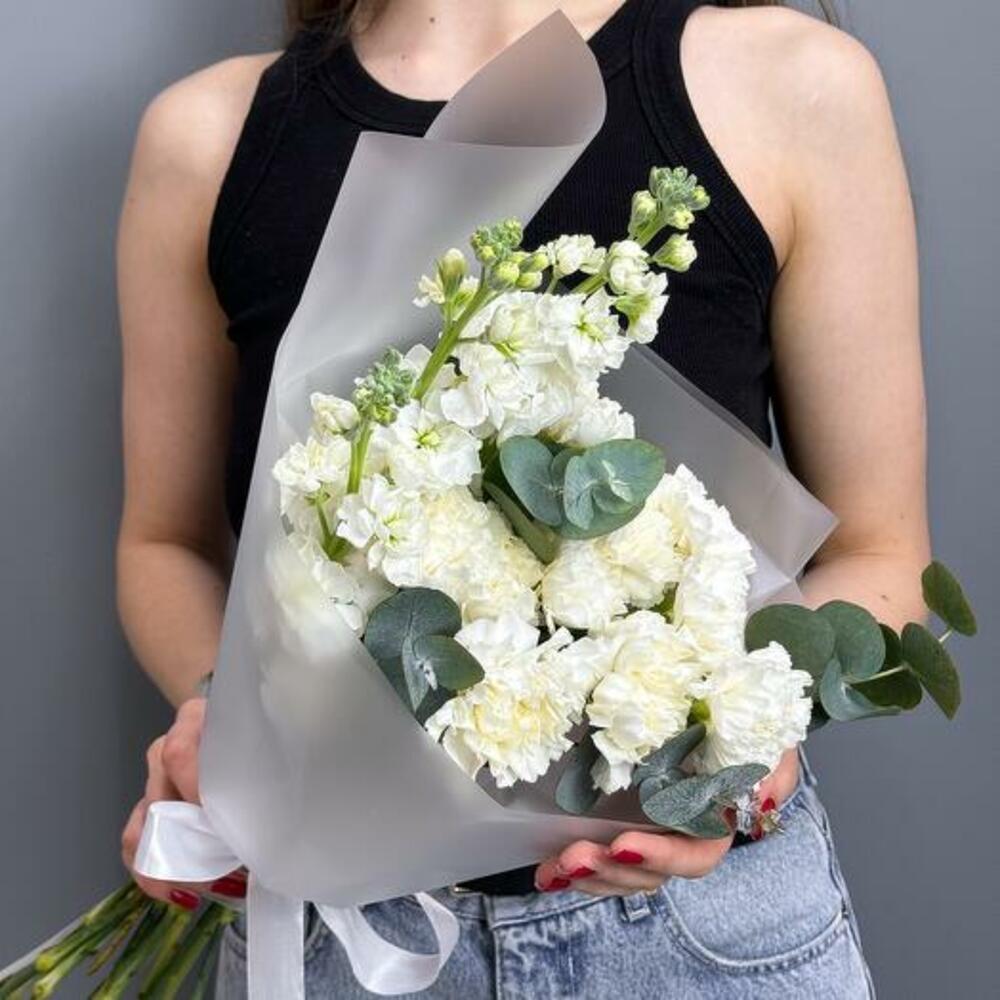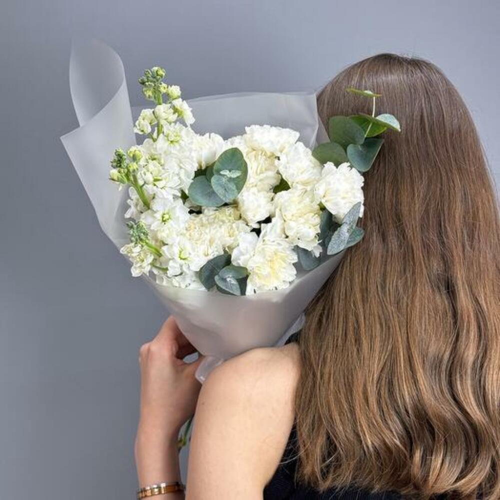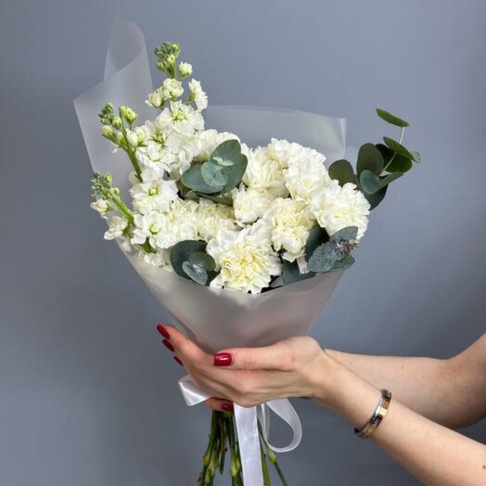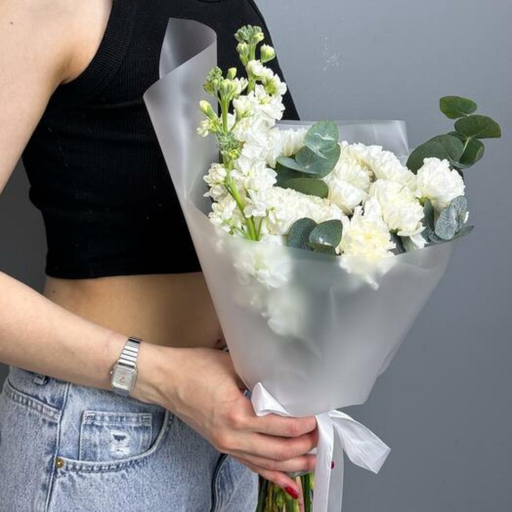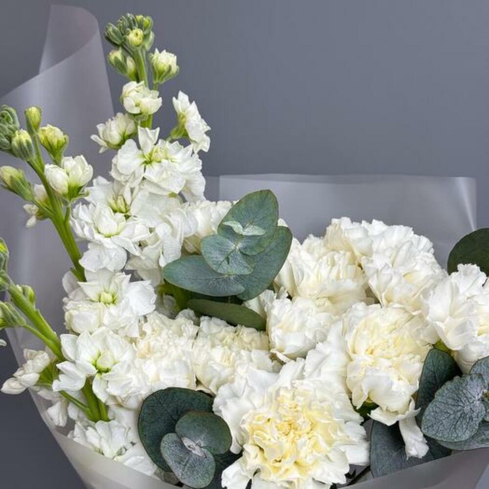 Découvrez la beauté raffinée de notre bouquet Pure Elegance, une composition exquise à base d'œillets blancs, de matthiola et d'eucalyptus. Ce bouquet somptueux incarne la sophistication et la grâce, en faisant le cadeau parfait pour toute occasion spéciale. Les œillets blancs, avec leurs pétales froncés, symbolisent l'admiration et l'amour pur. La matthiola, connue pour son parfum délicat, représente la beauté et un lien durable. L'ajout d'eucalyptus apporte une touche de verdure et un arôme rafraîchissant, renforçant le charme global du bouquet. Offrez le bouquet Pure Elegance à une personne chère ou faites-vous plaisir avec sa beauté intemporelle. Laissez le mélange harmonieux de fleurs blanches et d'eucalyptus apporter sérénité et élégance à n'importe quel décor.