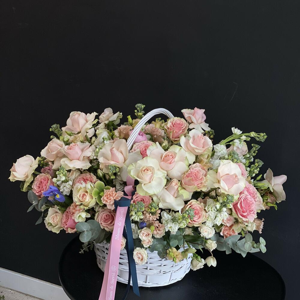 Spray rose - 5 pce Iris - 5 pce rose - 15 pce dianthus - 5 pce eucalyptus - 5 pce giroflée - 10 pce