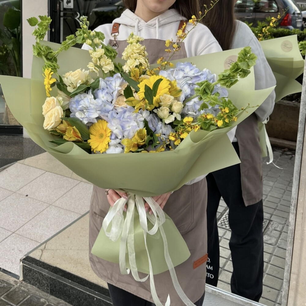 Matiola - 3 pce Alstroemeria - 3 pce hortensia - 6 pce Gerbera - 3 pce rosa - 4 pce cymbidium - 3 pce moluccella - 3 pce