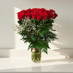 Ce splendide bouquet classique est composé de 24 roses rouges, embellies d'une sélection de feuillages. Pour ajouter une touche unique, le bouquet inclut également des éléments de remplissage. Idéal pour témoigner d'amour et d'admiration, ce bouquet représente la passion et la beauté classique. Parfait pour toute occasion.