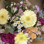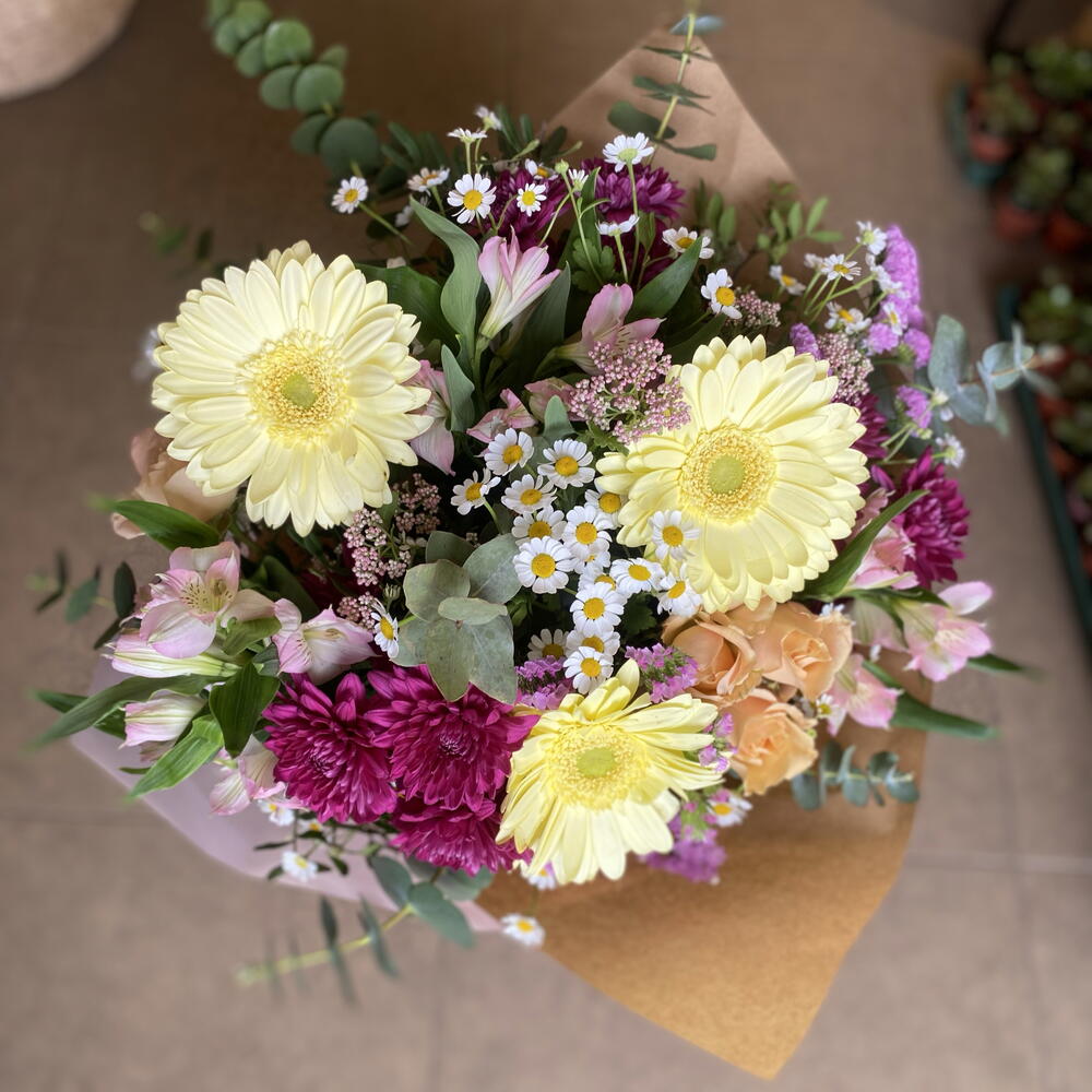 Este encantador arreglo floral De autor se compone de una cuidada selección de flores frescas y llenas de color. Cuenta con tres unidades de Statice, Gerbera y Alstroemerias, cada una aportando sus tonos únicos y distintivos al conjunto. Además, el ramo se adereza con tres Margaritas, dos Rosas Spray y tres Manzanillas, flores que añaden una fragancia exquisita al conjunto. El conjunto se completa con seis Verdes Variados y tres flores de arroz, proporcionando un contraste verde a este crisol de colores. El arreglo se presenta envuelto en un atractivo envoltorio decorativo y atado con una lazada, lo que lo convierte en el regalo perfecto para cualquier ocasión, o simplemente para alegrar el día a alguien especial.