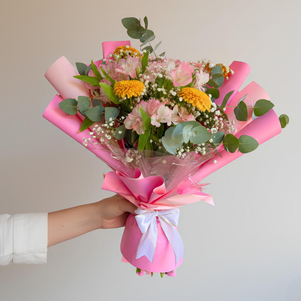 Enveloppé dans du papier rose avec un élégant ruban blanc, ce bouquet est parfait pour les anniversaires, les félicitations, les remerciements ou simplement pour offrir un sourire et remplir la journée de couleur et d'optimisme.