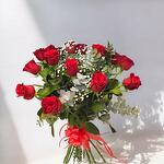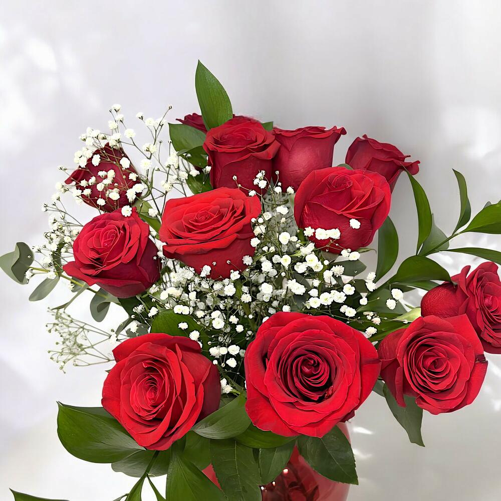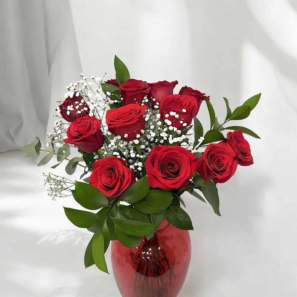 Ce beau bouquet classique est soigneusement composé de 12 roses vibrantes, complétées par 3 tiges de délicate paniculata et le tout orné de 3 fougères fraîches et vertes. Ce bouquet est la combinaison parfaite d'élégance et de fraîcheur, idéal pour égayer n'importe quel environnement. N'inclut pas de vases