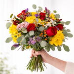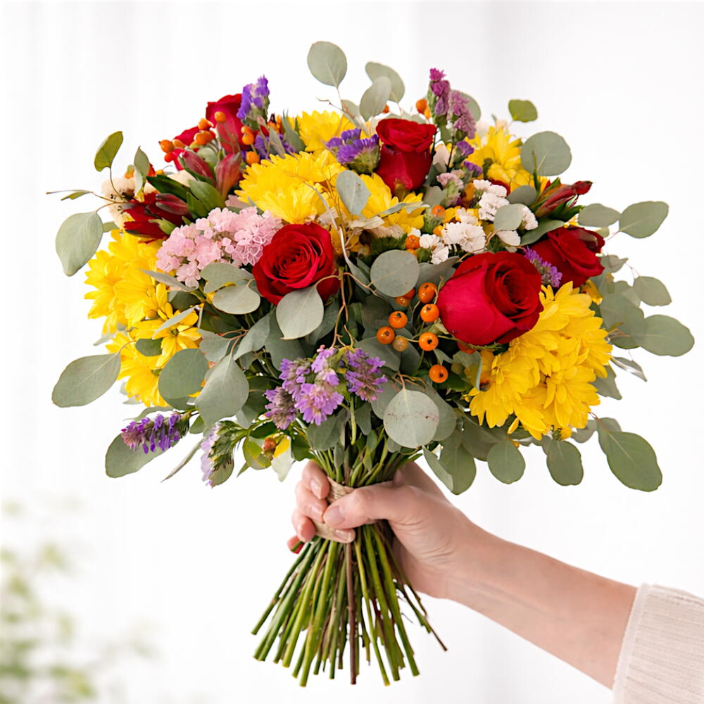 eucalyptus - 3 pce rosas rojas - 5 pce statice violet - 3 pce chrysanthèmes jaunes - 6 pce alstroemères rouges - 3 pce fleurs blanches de saison - 2 pce tiges d'hypericum orange - 2 pce