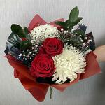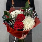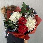 Ruscus - 2 pce Gypsophila - 1 pce rosa - 3 pce chrysanthème - 2 pce emballage avec ruban - 1 pce