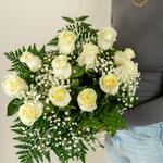 Este ramo clásico está diseñado con un toque elegante y suave. Consta de 12 hermosas rosas blancas, complementadas con 3 unidades de Paniculata y 3 de Helecho de cuero. Cada flor se ha elegido cuidadosamente para crear una armonía perfecta, reflejando elegancia y estilo clásico. Ideal para regalar en cualquier ocasión o simplemente para personalizar tu espacio.