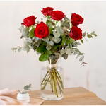 Bouquet de 6 roses rouges de grande qualité, accompagné de feuillages et garni de gypsophile